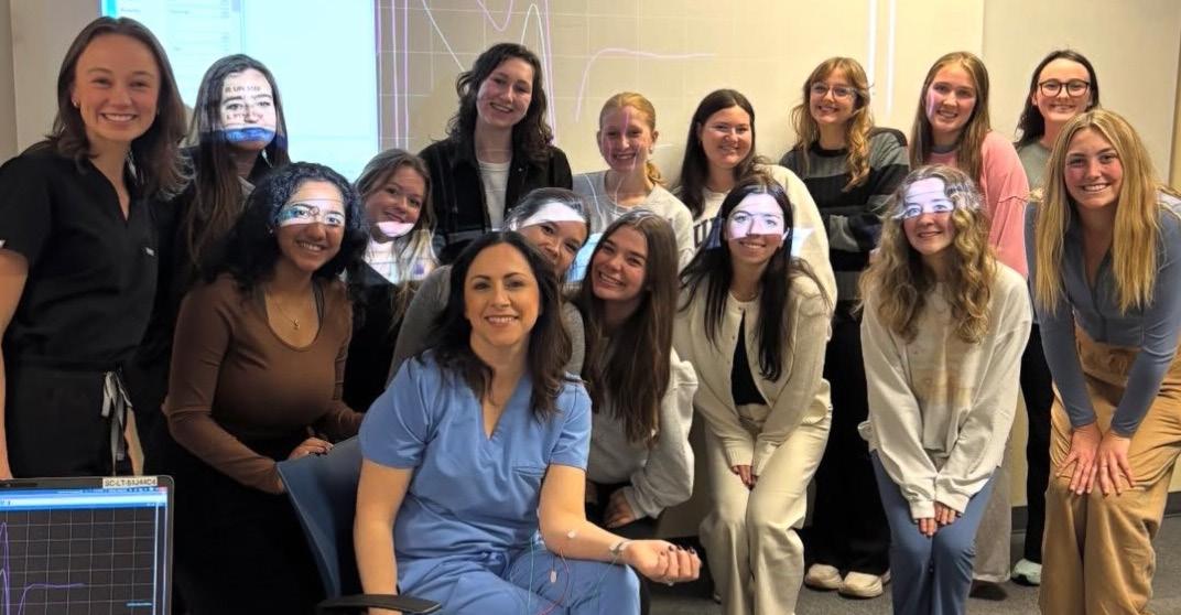(Below right (AL) Psi Chi members with SpecialtyCare representatives during an intraoperative neuromonitoring demonstration.
