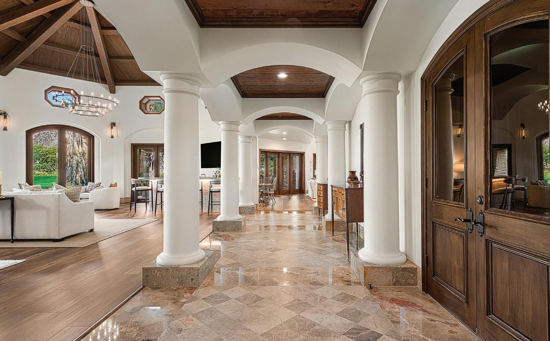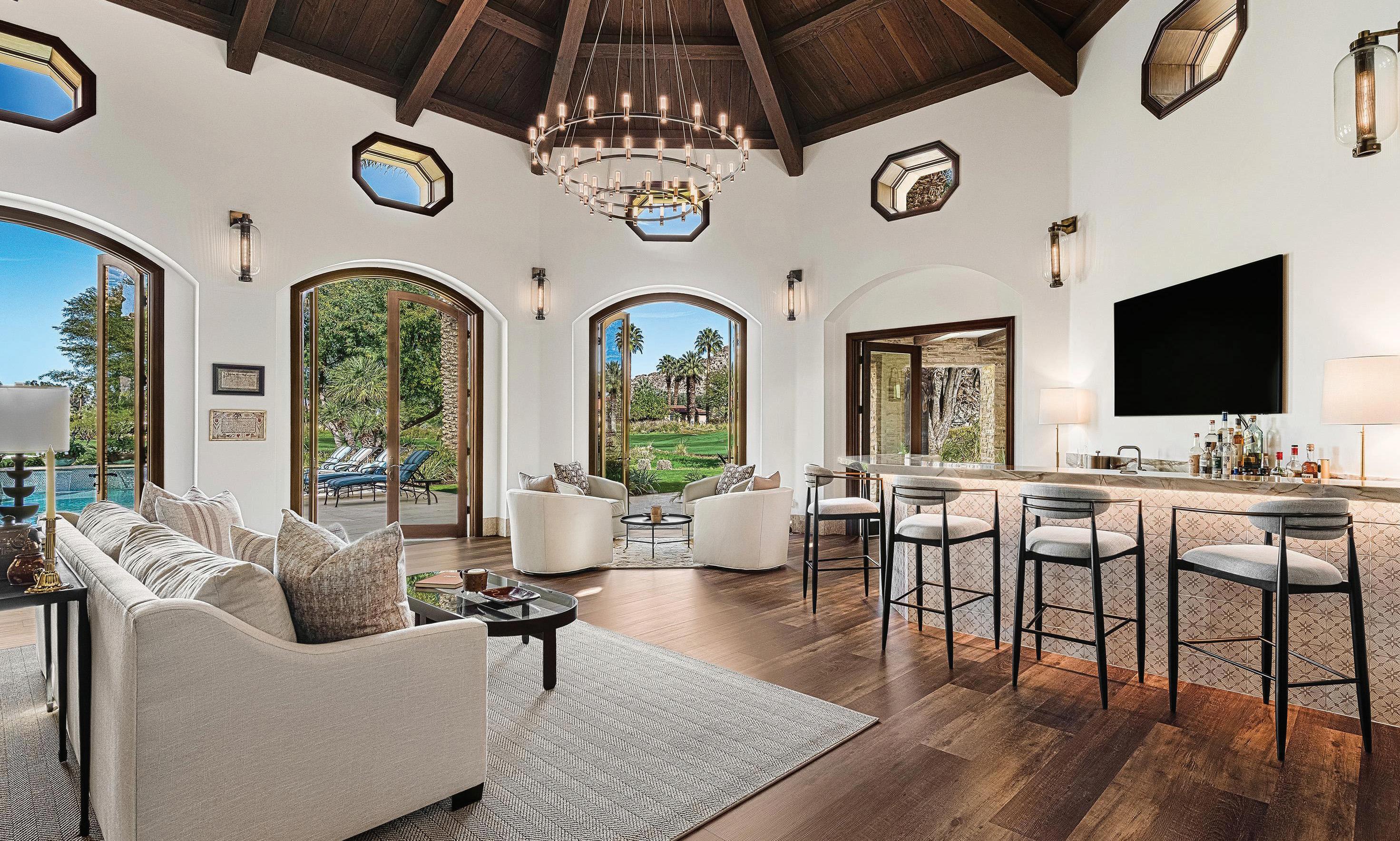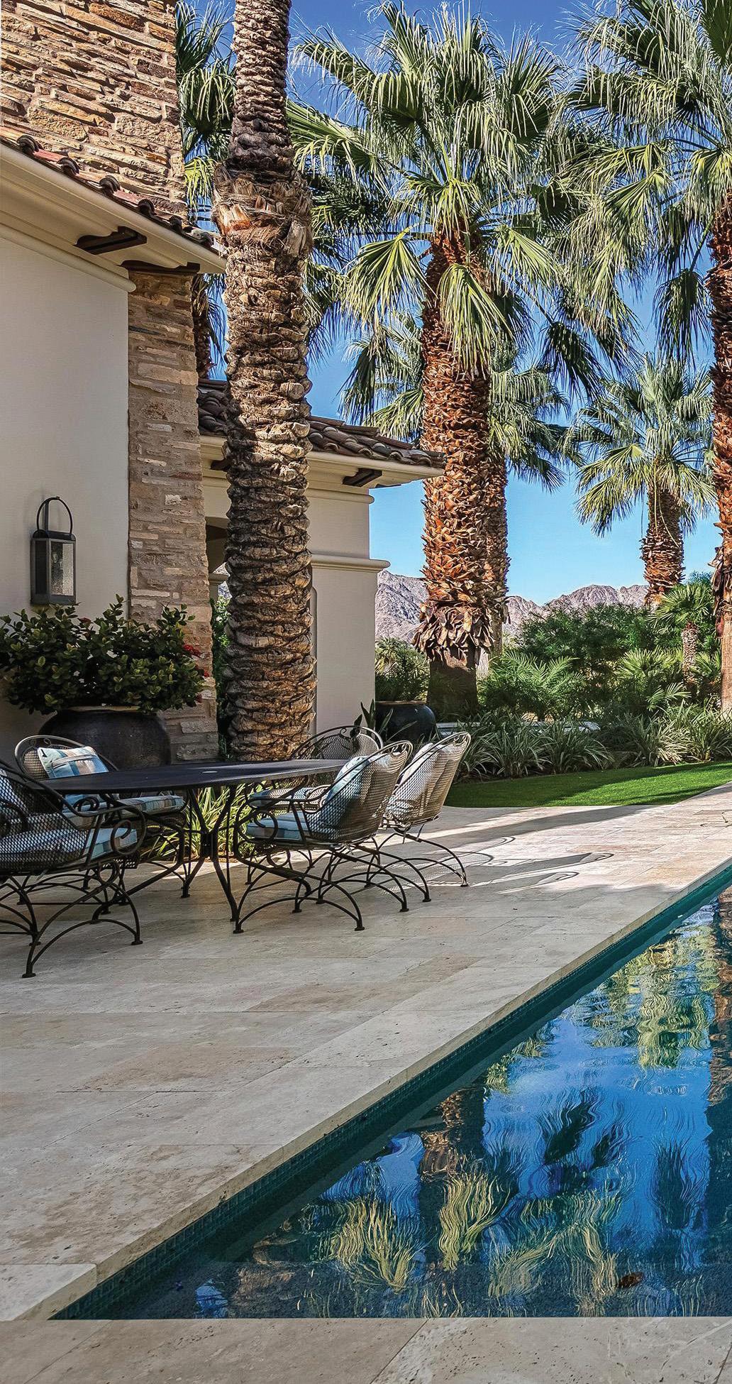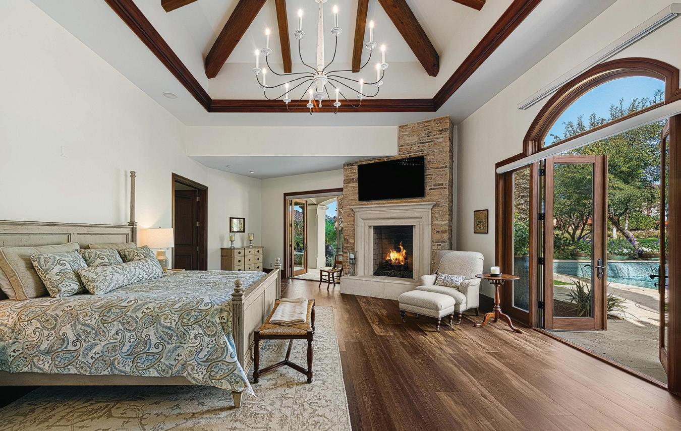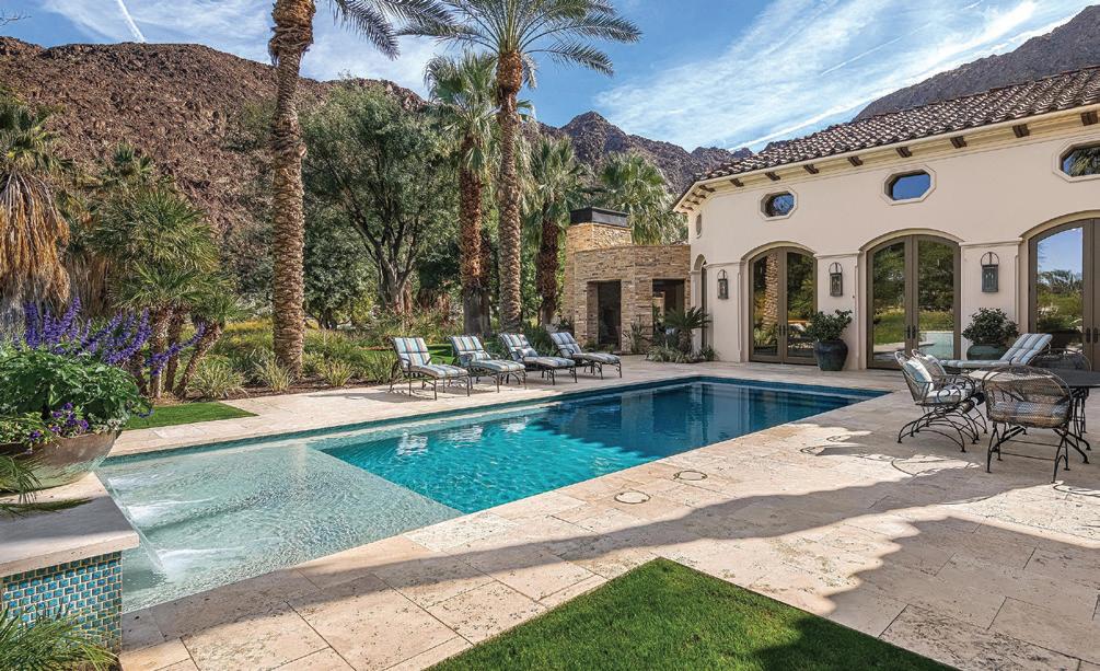 Behind the guarded gates of La Quinta’s exclusive Tradition Golf Club awaits a spectacular, Mediterranean-style estate overlooking the 18th fairway of one of the country’s most exceptional golf courses. The five-bedroom, 7,419-squarefoot (approximate) home has undergone extensive renovations, elevating and modernizing its luxe European aesthetic with timeless, highly-functional finishes. Beamed, cathedral ceilings add drama and expanse to a home that courts comfortable luxury and fully embraces indoor-outdoor living. An attached two-bedroom casita with shared sitting room completes the world-away feel of the entire property.
