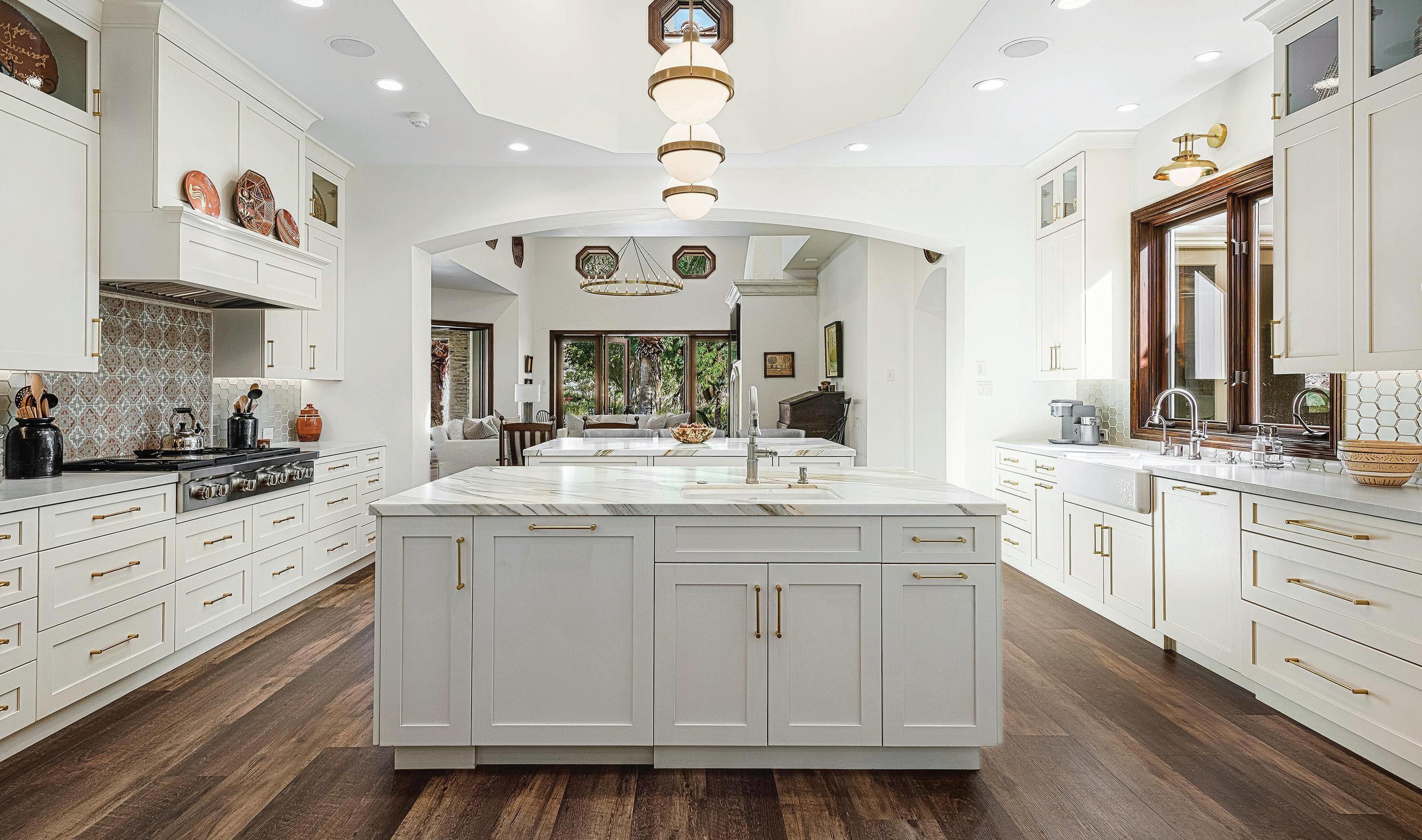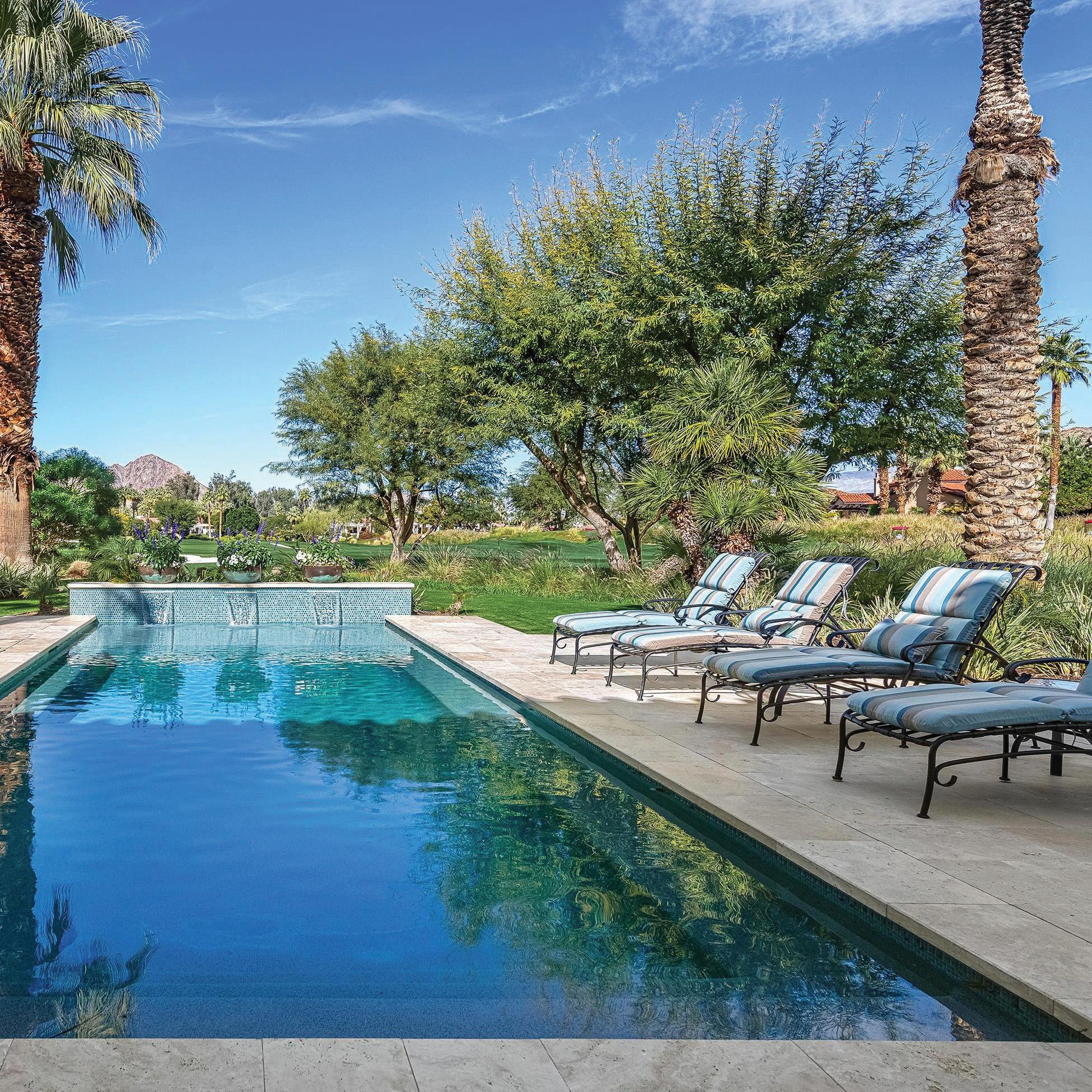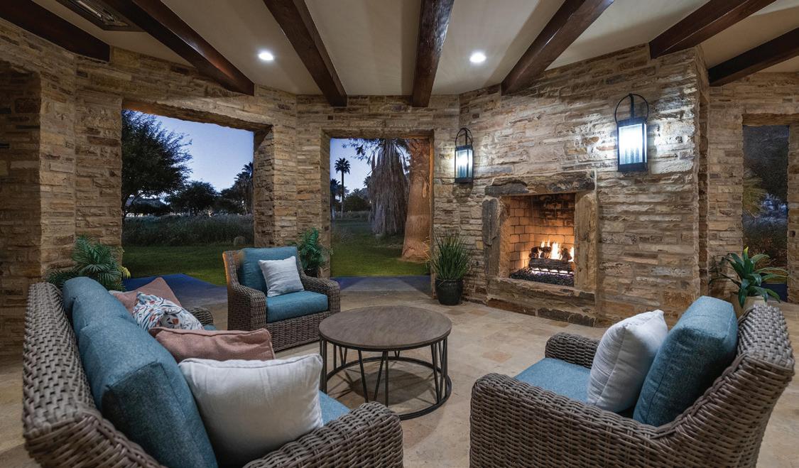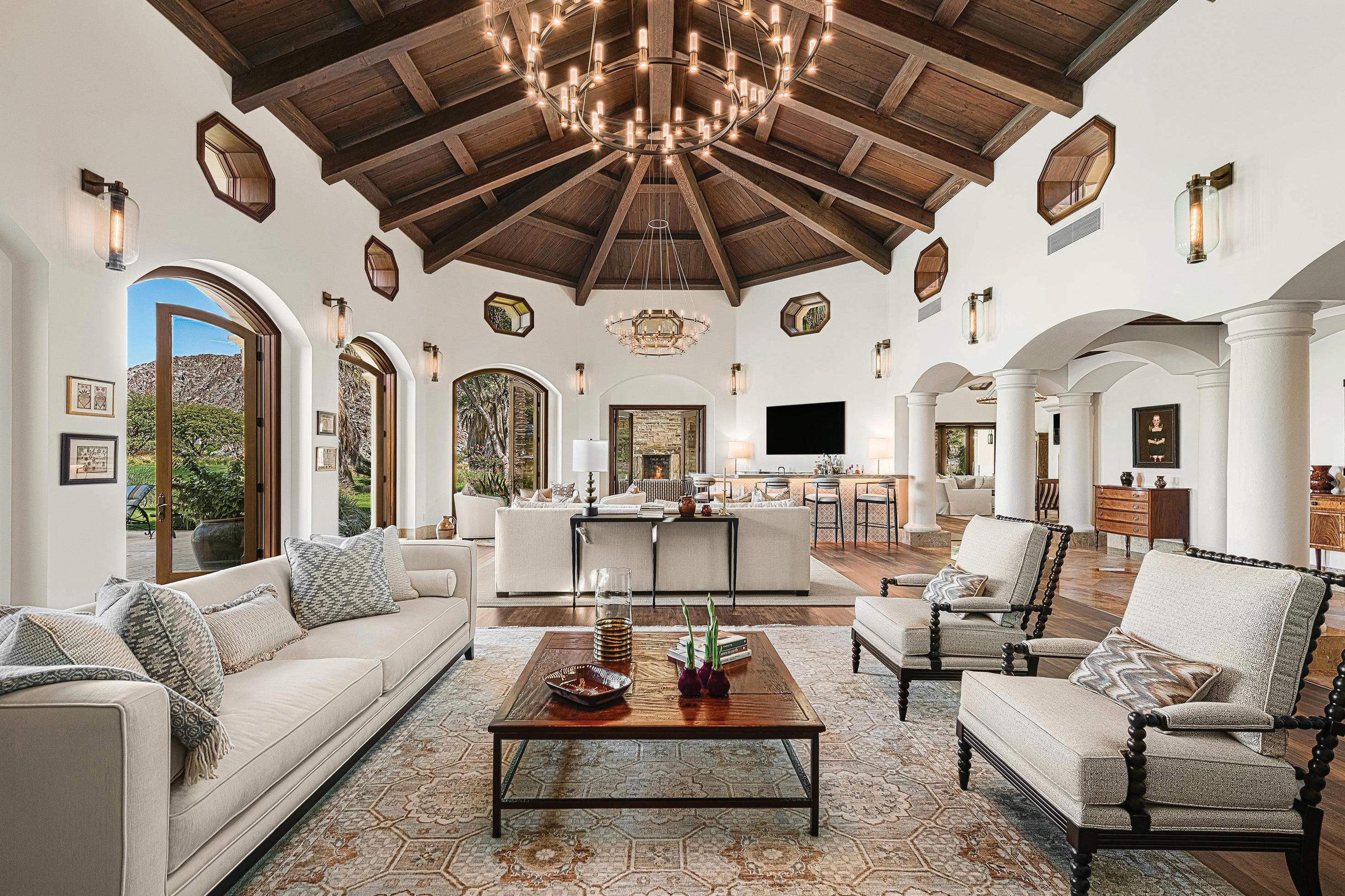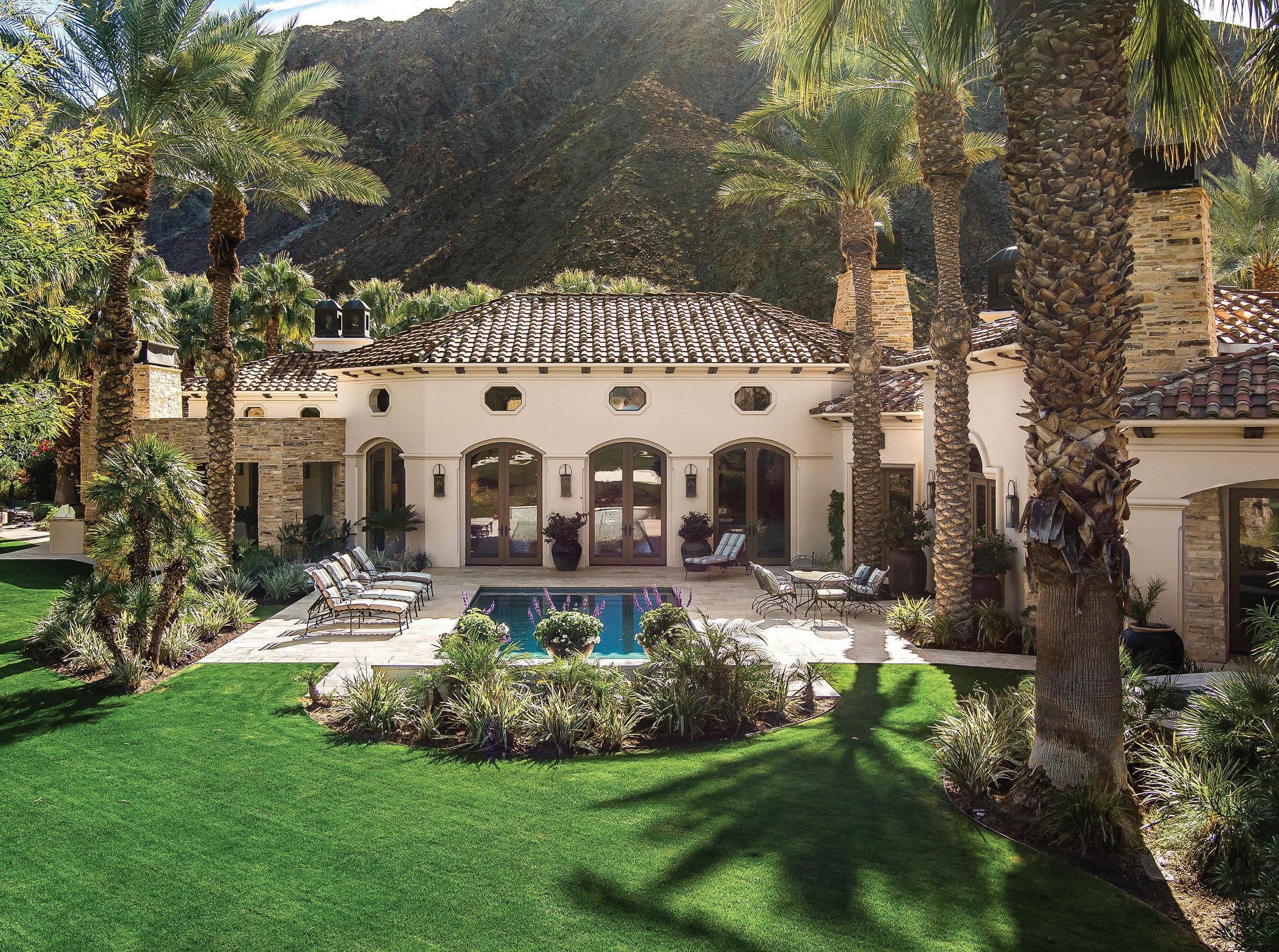 Behind the guarded gates of La Quinta’s exclusive Tradition Golf Club awaits a spectacular, Mediterranean-style estate overlooking the 18th fairway of one of the country’s most exceptional golf courses. The five-bedroom, 7,419-squarefoot (approximate) home has undergone extensive renovations, elevating and modernizing its luxe European aesthetic with timeless, highly-functional finishes. Beamed, cathedral ceilings add drama and expanse to a home that courts comfortable luxury and fully embraces indoor-outdoor living. An attached two-bedroom casita with shared sitting room completes the world-away feel of the entire property.