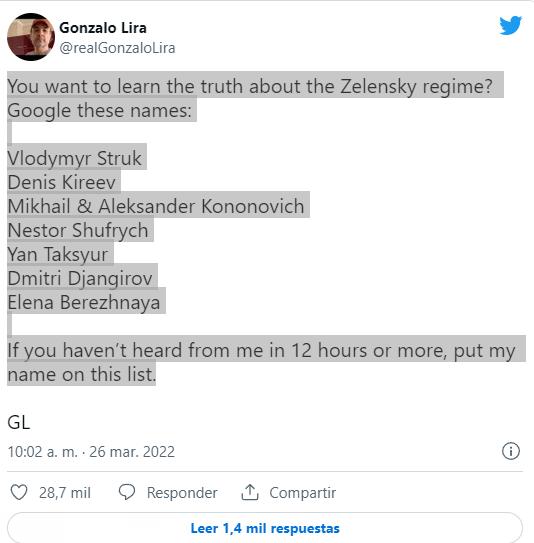 Como se puede ver en su cuenta de Twitter, Lira comenzó a ser un claro opositor del presidente Volodímir Zelenski, acusando al gobierno ucra niano de secuestrar a sus opositores y develando una tendencia nazi en sus soldados.