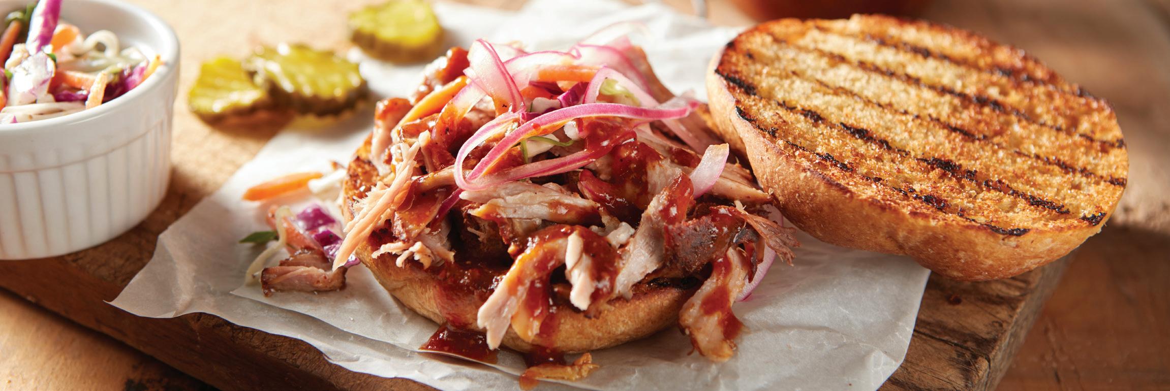 9. Serve the pulled pork on buns with fixings, such as bread and butter pickles, sliced sweet onions and pickled sweet or hot peppers, if desired.