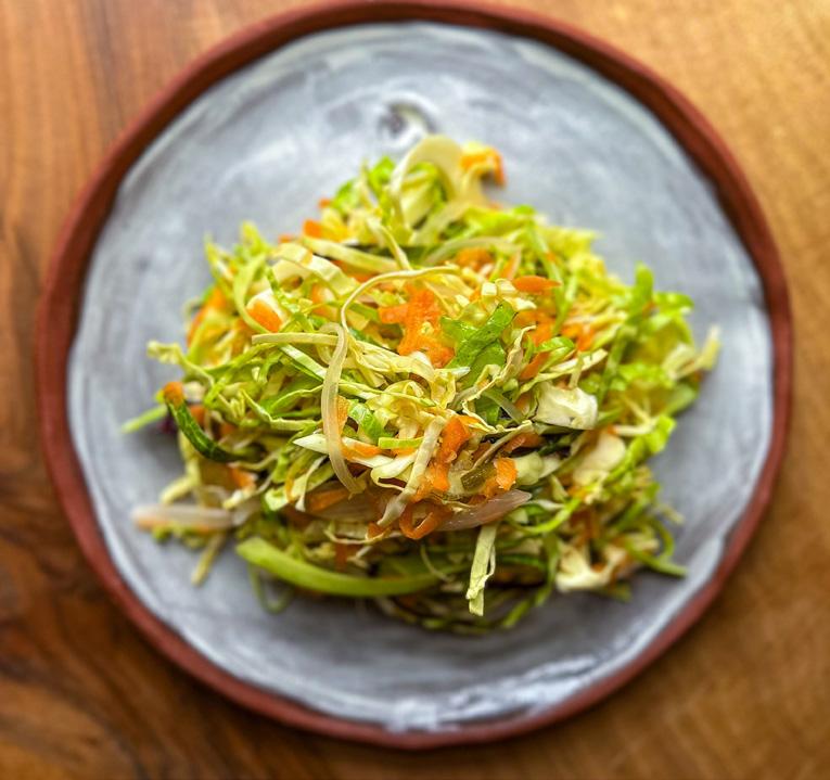 Pour the dressing over the cabbage and veggie mix and let it meld in the fridge for 1 hour before serving.