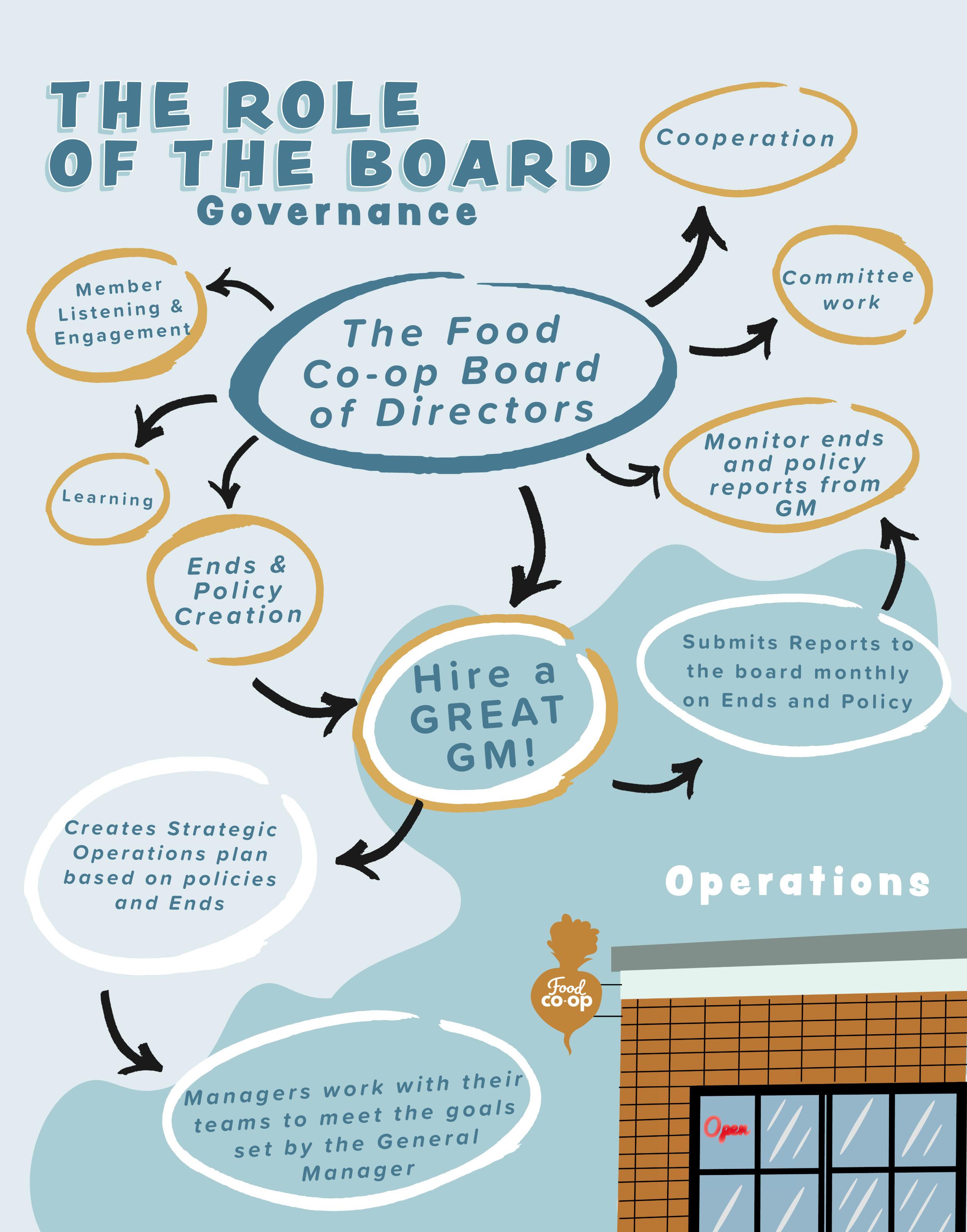 What the board does not do is supervise the day-today operations of the Co-op. We are member-owners, not experts in the grocery business or running a store. Instead, the board hires a great general manager, who is an expert in this area, delegating all operational duties to them. The board write policies that create a framework within which the general manager works to fulfill our Ends while upholding our standards and