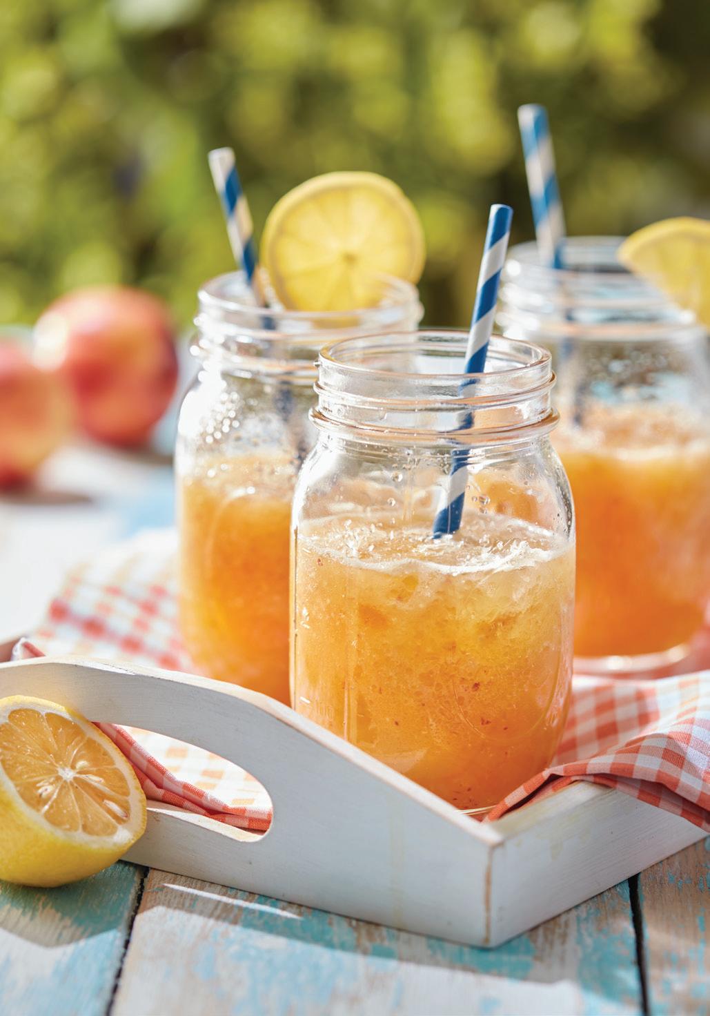 This fizzy drink pairs the sweetness of ripe peaches and the spicy kick of fresh ginger. Pour over crushed ice and garnish with lemon slices for the perfect summer spritzer!