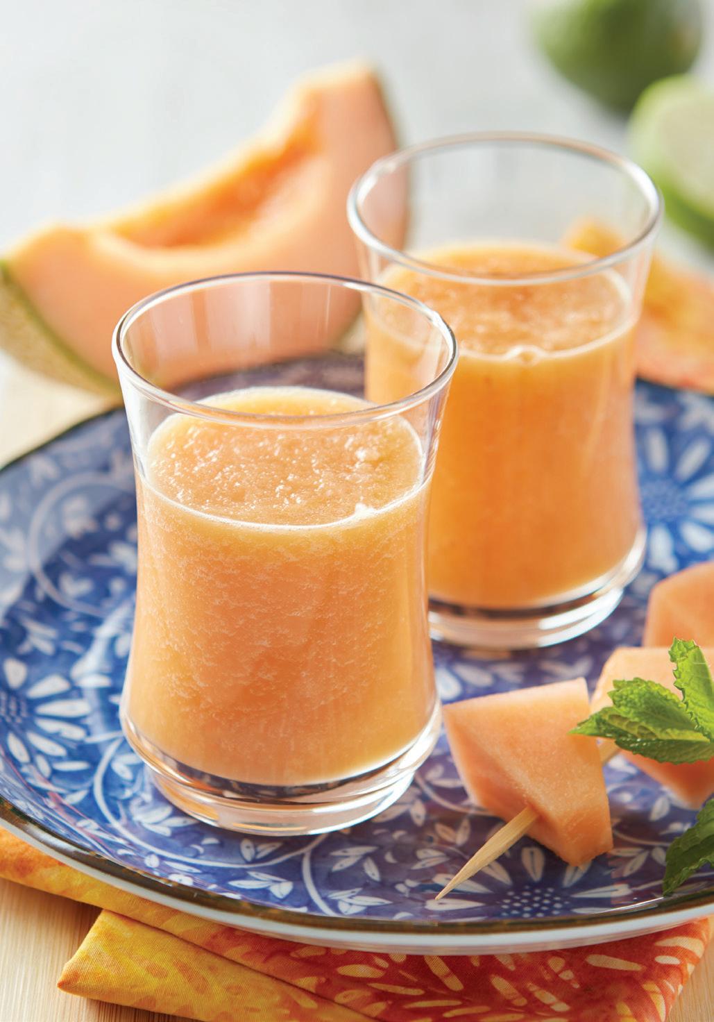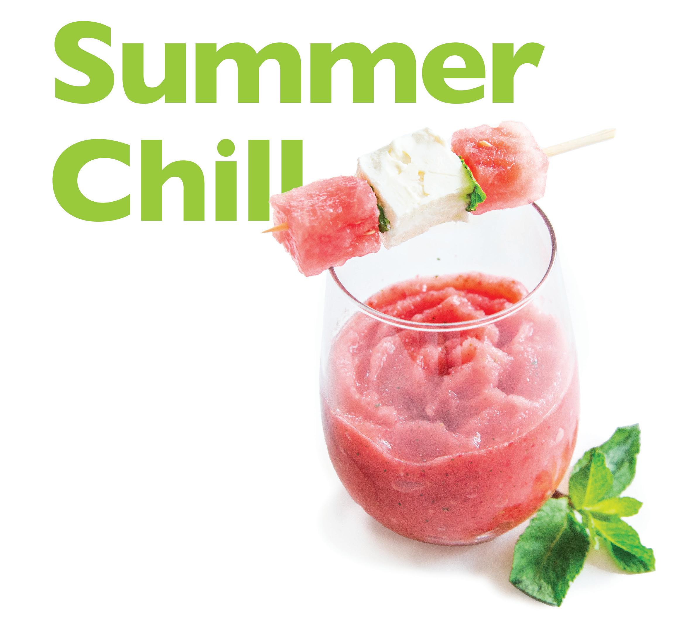 2. Just before serving, combine the frozen watermelon, strawberries, rosé and mint in a blender. Secure the lid and blend until smooth.