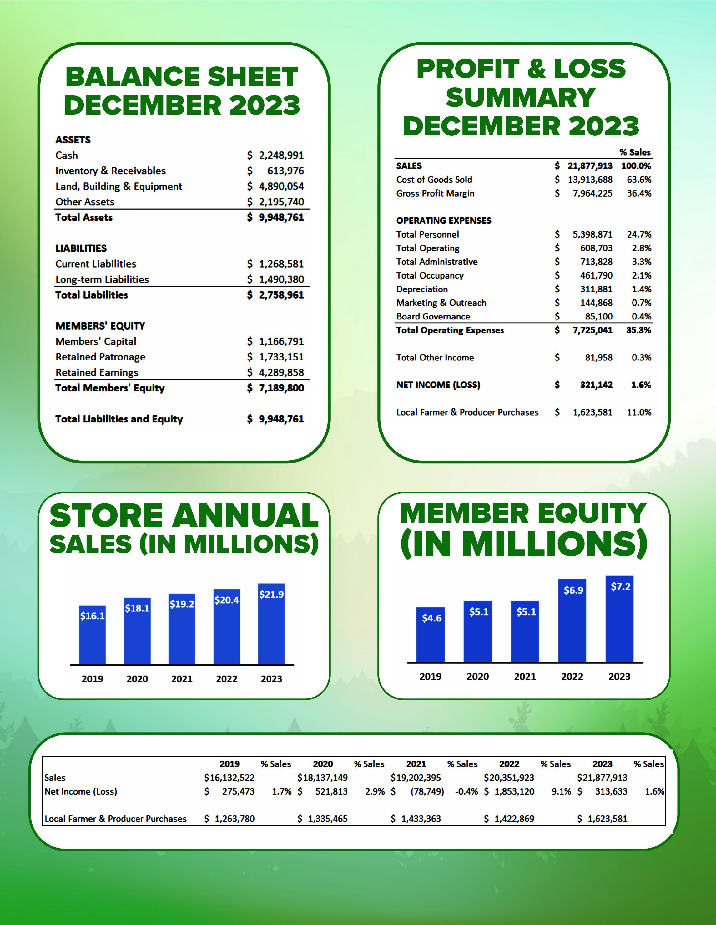 Financially speaking, 2023 was a good year for The Food Co-op and we ended the year with 1.6% net profit (the profit that is left over after all expenses have been paid). We will be sharing this profit with our members, as a patronage dividend; comprised of 100% of the profits generated by member sales, to be split 70/30. Given today’s economic climate, retaining 70% of patronage equity for the store’s growth made sense for us. And the 30% we are returning is a bit more than we normally would and is an expression of gratitude for our members who have continued to support their co-op even during uncertain economic times. This dividend represents an opportunity to further build our equity and access to capital, as well as continuing to create a stronger buffer against the future unknowns.