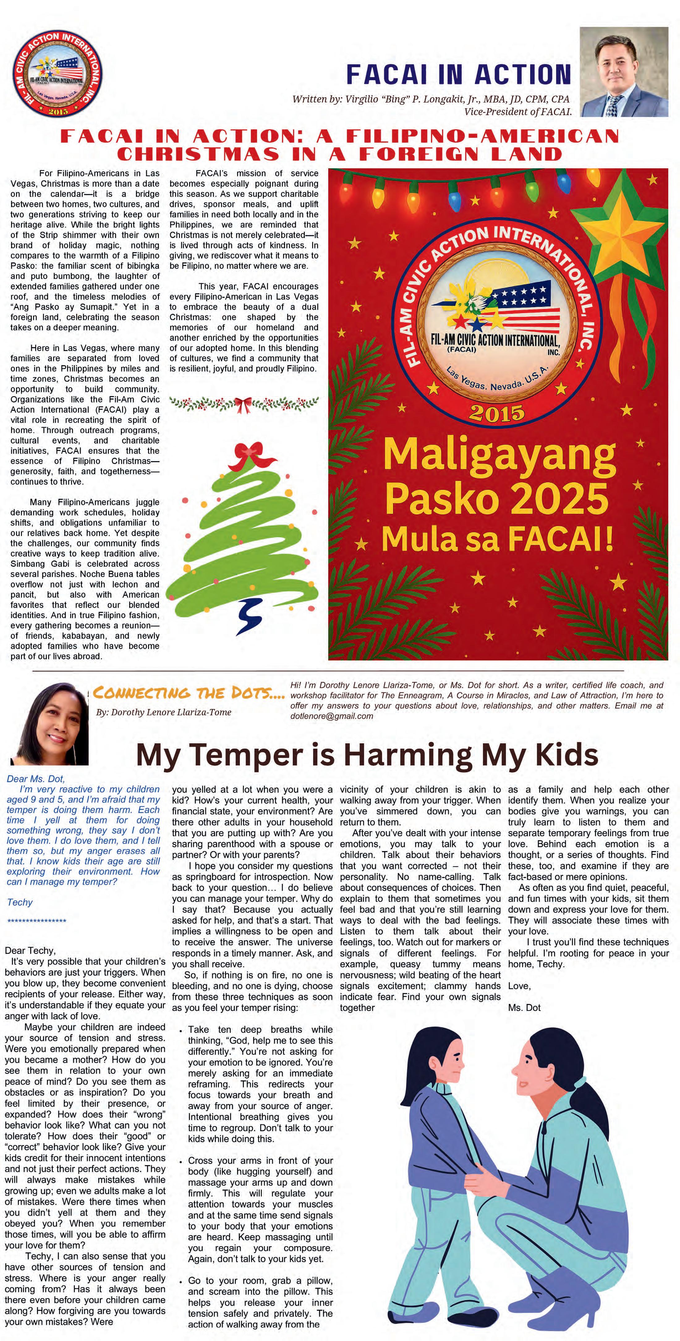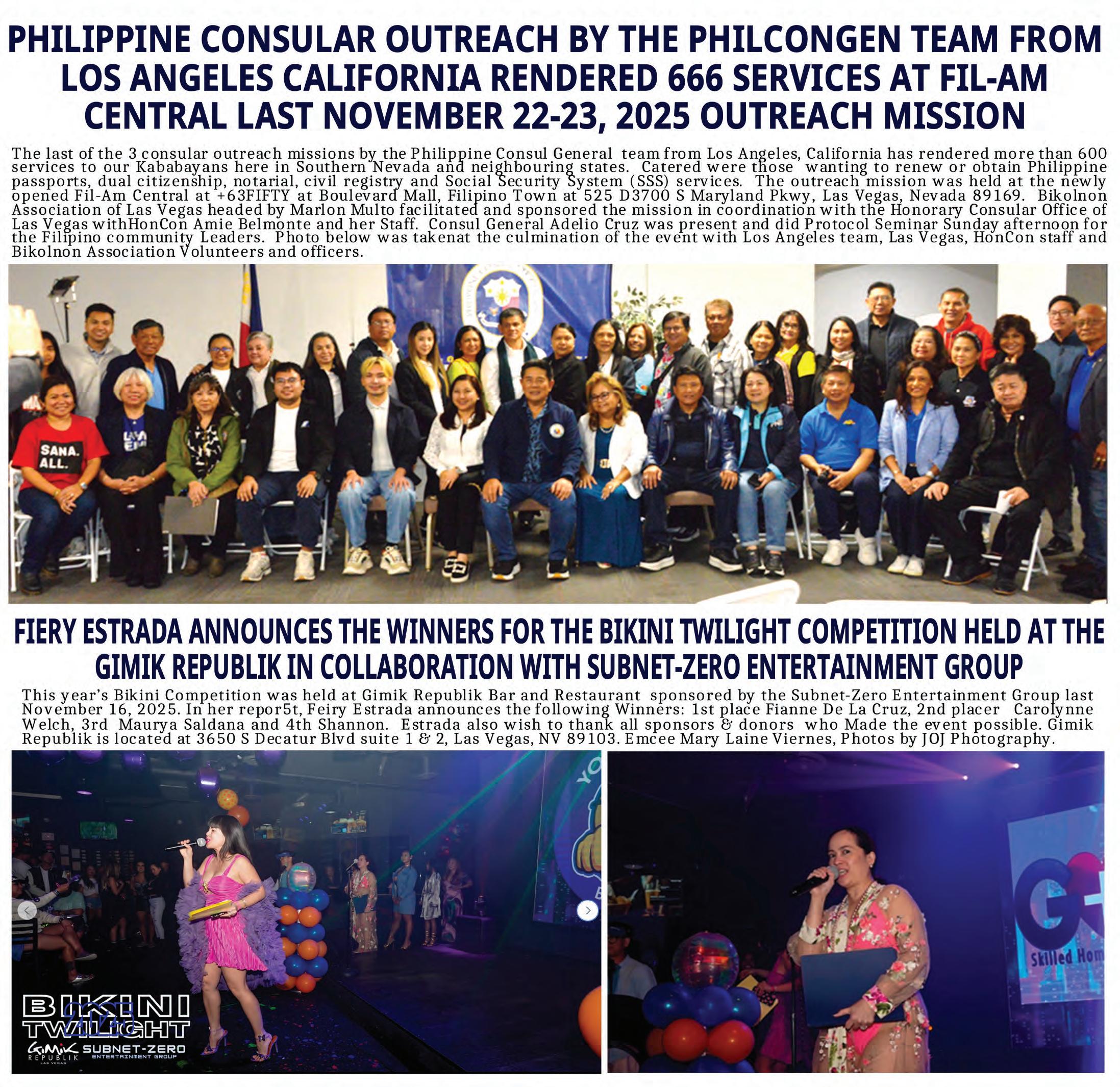 reminder that someone across the globe sees them, thinks of them, and stands with them. PACF’s Bags of Hope initiative is more than charity—it is connection. It is diaspora love made tangible. It is the Filipino American community in Las Vegas reaching back home, honoring roots, and paying forward the blessings found in a new land. As President Luz Micabalo and Chair Gloria Caoile often remind supporters, the true success of Bags of Hope lies in its consistency. Year after year, the mission continues— quietly, faithfully, and with deep commitment. And each time, the circle of generosity widens as more donors, partners, and volunteers become part of
