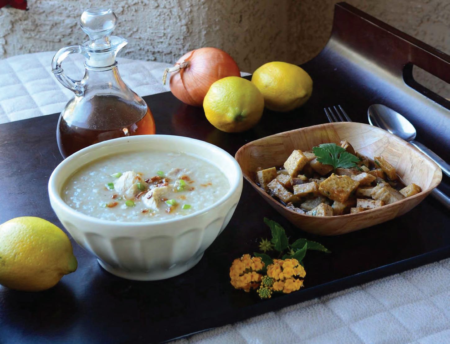 Chicken Arroz Caldo Golden rice porridge simmered with chicken, ginger, and kasubha, crowned with a boiled egg, fried garlic, scallions, and calamansi on the side. Eat slowly, or not at all.