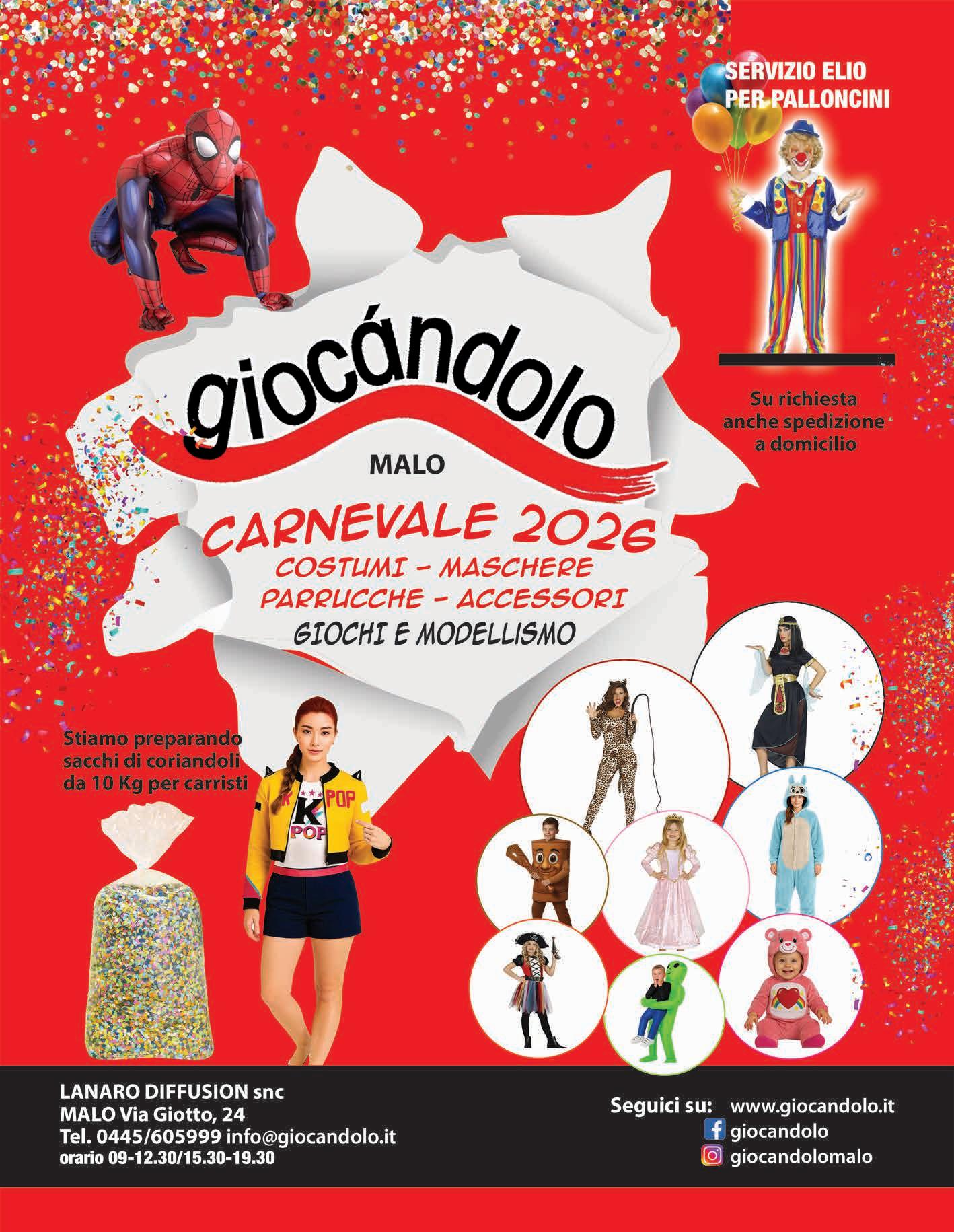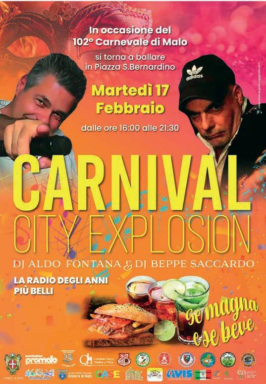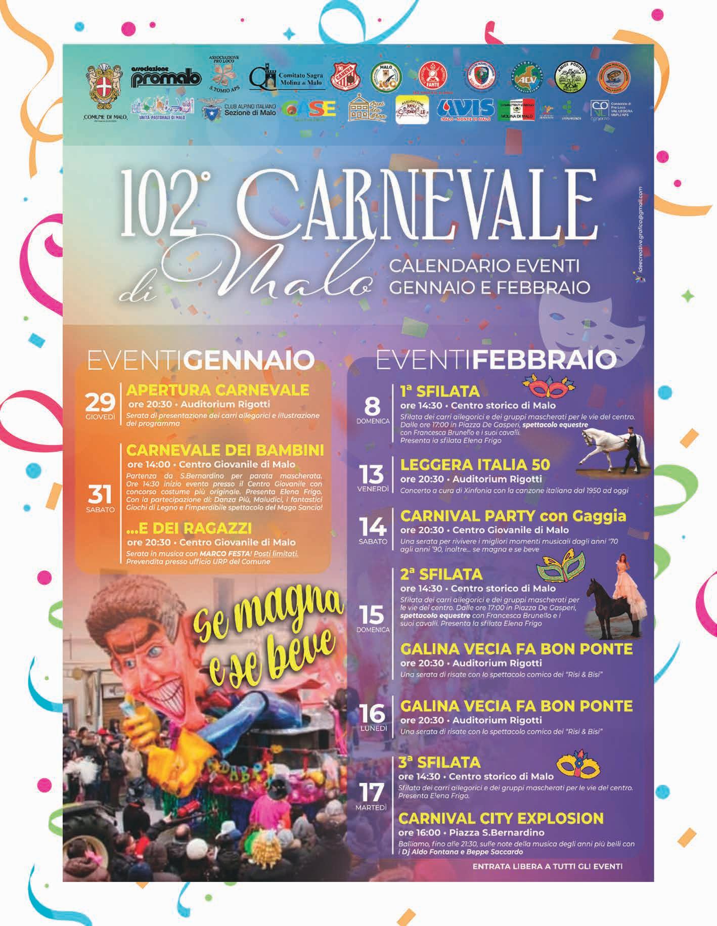 Un grande evento di comunità tra tradizione, musica e spettacolo. Il Comune di Malo, capofila dell’organizzazione e del coordinamento dell’intera manifestazione, con la collaborazione dei dipendenti comunali, della Pro Loco di Malo che mette a disposizione il tradizionale Ciaci, simbolo della kermesse, e grazie al fondamentale contributo delle numerose associazioni del territorio e delle frazioni, è lieto di annunciare la 102a edizione del Carnevale di Malo. L’evento è un appuntamento che appartiene a tutta la comunità: proprio per questo l’Amministrazione comunale ha voluto promuovere un progetto condiviso che coinvolge, per la prima volta in modo strutturato, le associazioni che operano sia nel capoluogo sia nelle frazioni, valorizzando il contributo di ciascuna realtà del tessuto associativo locale.