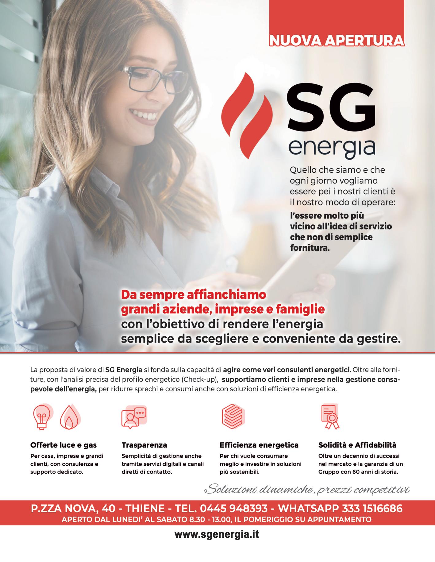 Trasparenza e serietà. Sono state queste le parole d’ordine durante l’inaugurazione del nuovo Energy Point di SG Energia a Thiene, in Piazza Nova. Un evento che ha visto la partecipazione delle autorità cittadine, dei consulenti locali e dei vertici della sede centrale di Milano, uniti per celebrare l’apertura di un presidio che punta tutto sulla fiducia e sul risparmio concreto