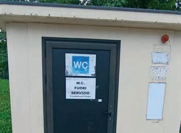 Sotto a “WC fuori servizio”, e questo che si trova vicino al Parco Robinson lo è da tempo immemore, sta scritto “Ci scusiamo per il disagio”. No, no, no, scuse non accettate: siamo a disagio sia perché c’è chi danneggia, sia perché c’è chi non sistema. L’impossibilità di accedere è in second’ordine: il disagio civico viene prima di quello fisico. [M.D.Z.]