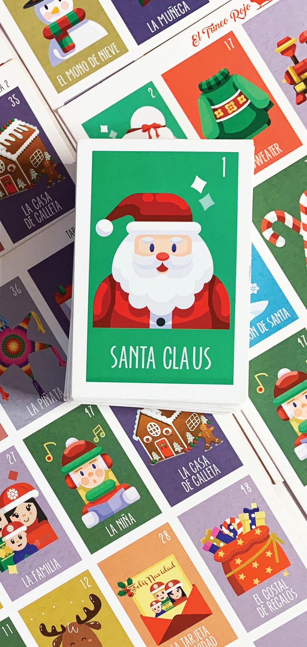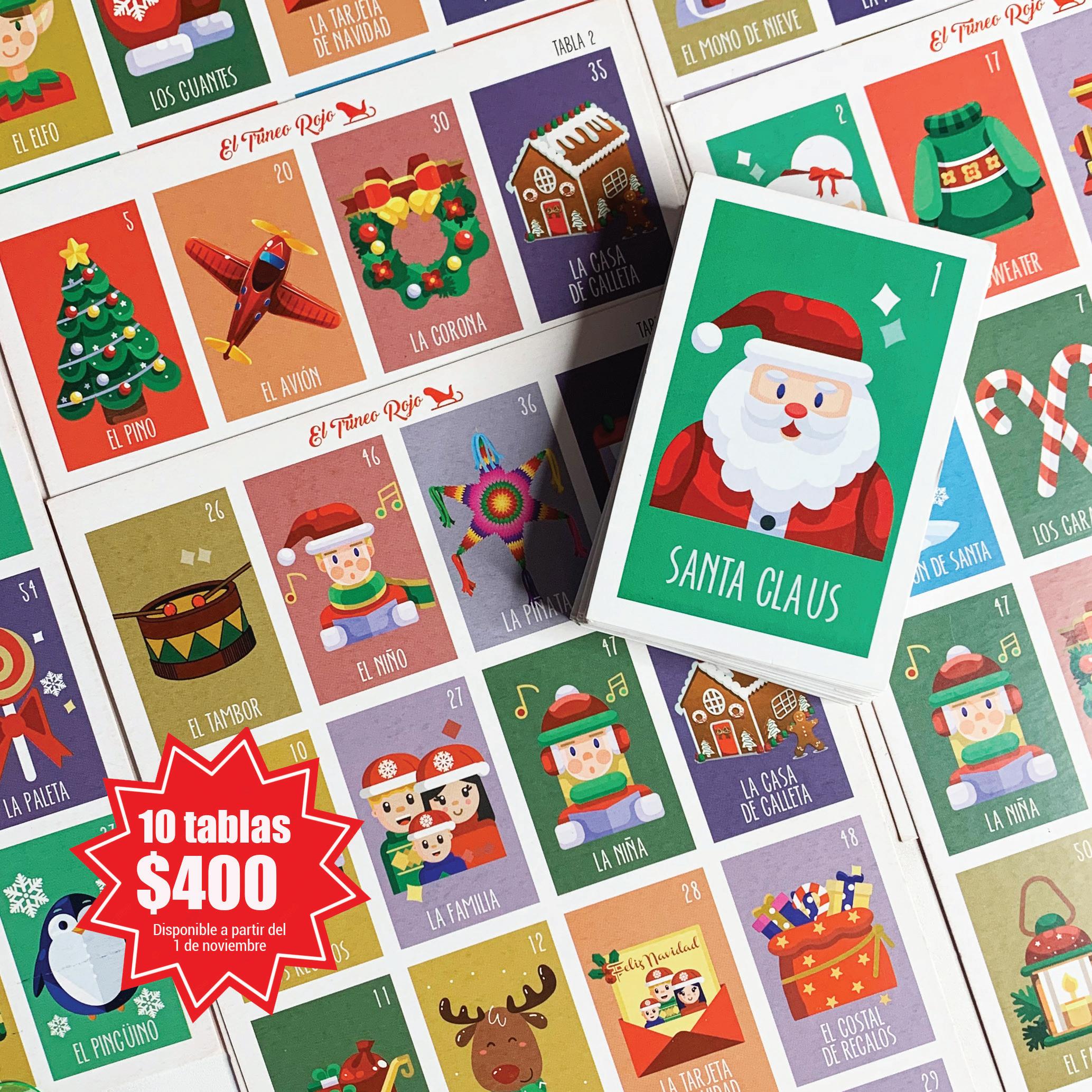 Vive la magia de la Navidad con nuestra Lotería Navideña, un juego diseñado por El Trineo Rojo para compartir momentos inolvidables en familia. Sus cartas ilustran entrañables personajes como Santa Claus, la Señora Claus, los Reyes Magos, Jesús, María y José, además de símbolos navideños clásicos como el pino de Navidad, las esferas y la casita de galletas, entre muchos otros.