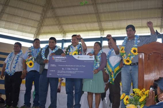 Plurinacional de Bolivia, Luis Arce Catacora, en compañía del ministro de Desarrollo Rural y Tierras, Remmy Gonzales Atila y otras autoridades municipales, entregó en el municipio de Cuatro Cañadas del departamento de Santa Cruz, cheques de indemnización que benefician a productores de trigo que fueron afectados por diferentes fenómenos climáticos.