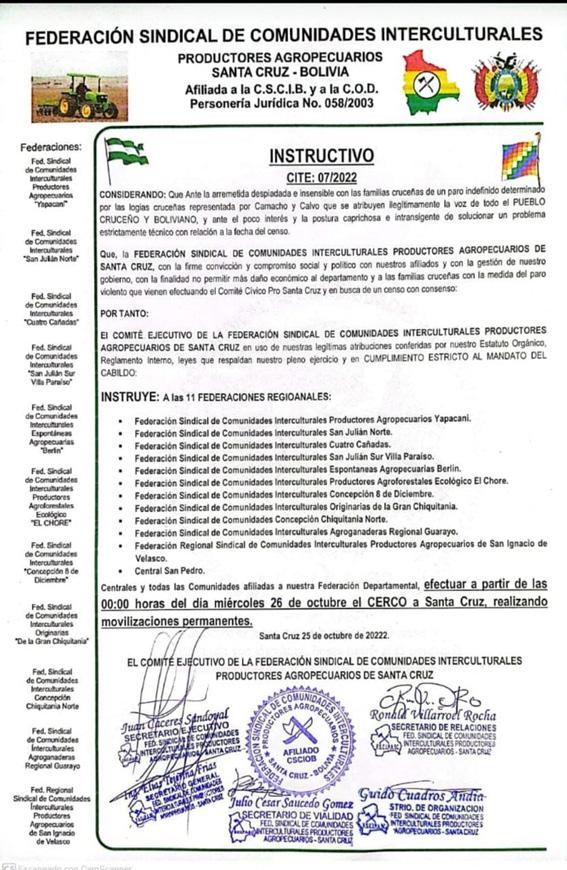 Por otra parte, tam bién están analizan do la situación con los productores, para ver cuál ha sido el impacto en estos días de paro y poder afrontar el cerco a Santa Cruz y abaste cerse de insumos.