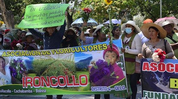 Productores de flores de Cochabamba se declararon en emergencia y denunciaron una pérdida de 25 millones de bolivianos producto de los bloqueos en Santa Cruz. Ayer marcharon por el centro de la ciudad de Cochabamba exigiendo al Gobierno que se solucionen los conflictos por la fecha del censo.