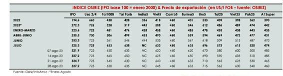 ¨En agosto, el índice OSIRIZ/InfoArroz (IPO) subió significativamente de 40,5 puntos a 325,3 puntos (base 100 = enero de 2000), contra 284,8 puntos de julio. A mediados de septiembre, el índice IPO tendía a replegarse a 322 puntos¨, explicó Patricio Mendez, analista económico.