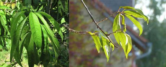 Las hojas son simples, lanceoladas, alternas con el margen finamente aserrado. Su tamaño varía entre 5 a 12 cm de largo por 3 a 5 cm de ancho.