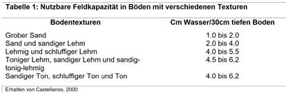 Die Bodenfeuchtigkeit ist ein äußerst wichtiger Faktor für eine gute Entwicklung der Pflanzen, was sich unmittelbar auf die Erträge auswirkt, da die Pflanzen ohne die erforderliche Feuchtigkeit nicht optimal wachsen können. Die Fähigkeit des Bodens, Feuchtigkeit zu speichern, die von den Pflanzen genutzt wird, wird als nutzbare Feldkapazität bezeichnet und variiert je nach Bodenart (siehe Tabelle 1) und den im Produktionssystem angewandten Verfahren. Die Bodenfeuchtigkeit beschreibt die im Boden vorhandene Wassermenge. Das Wasserpotenzial gibt an, inwieweit Wasser an den Bodenpartikeln haftet. Sie beeinflusst den Luftgehalt und den Salzgehalt des Bodens. Die Werte der Bodenfeuchtigkeit und des Wasserpotenzials sind in einem landwirtschaftlichen System wichtig, um die Häufigkeit der Bewässerung und die Menge des ausgebrachten Wassers für jede Pflanzenart festzulegen.