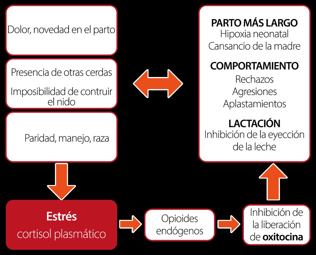 El parto causa estrés fisiológico. Se cree que el aumento del cortisol sérico en el período postparto en las cerdas es una consecuencia de dos factores: primero, el dolor siempre va acompañado de una respuesta al estrés, y segundo, cualquier situación nueva o poco común puede desencadenar una respuesta al estrés.
