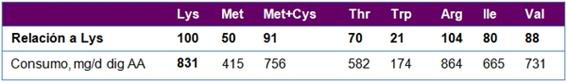 No obstante, una proporción de aminoácidos y de nitrógeno no-proteico ofrecidos mediante el alimento balanceado no se procesa bien en el tracto digestivo, generando sustratos para microbios y toxinas para el animal. Este material, por lo tanto, puede atacar al íleon, causando un crecimiento excesivo de bacterias patógenas, desequilibrio del ecosistema intestinal, irritación intestinal, disbacteriosis y, en algunos casos, enteritis necrótica subclínica. Las partículas grandes e insolubles de proteína que no son asimiladas por el animal, van al intestino grueso, saliendo del sistema digestivo a través de las heces. Sin embargo, partículas pequeñas y solubles de proteína pasan a través de la unión ileocecal al ciego, donde ocurre su descomposición (putrefacción) y se producen amoniaco, aminas, índoles y ácidos grasos de cadena ramificada. Estos compuestos pueden ser tóxicos y problemáticos. El exceso de proteína no solo aumenta los costos de producción, sino que también genera problemas de salud en el ave. Sin embargo, la reducción de proteína cruda (nitrógeno total) en el alimento balanceado debe ir acompañada de un equilibrio del perfil de aminoácidos y de un suministro de acuerdo a los requerimientos de las aves. Una nutrición precisa (aminoácidos) implica conocimientos de materia prima (aminoácidos), digestibilidad, consciencia de un pobre procesamiento de fuentes de proteína y del uso de aminoácidos puros que estén disponibles. Este enfoque puede satisfacer las demandas de mantenimiento, desafíos de salud y producción de huevo sin un exceso de nitrógeno. El balance correcto de aminoácidos digestibles, también llamado “Perfil Ideal de Aminoácidos”, se muestra en la Tabla 1.