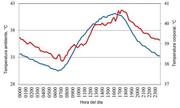 Figura 1. Variaciones en la temperatura corporal (rojo) de cerdos alojados en condiciones de estrés por calor, en respuesta a cambios en la temperatura ambiente (azul) durante un día típico del verano del año 2015 en el valle de Mexicali (Cervantes et al., 2017).