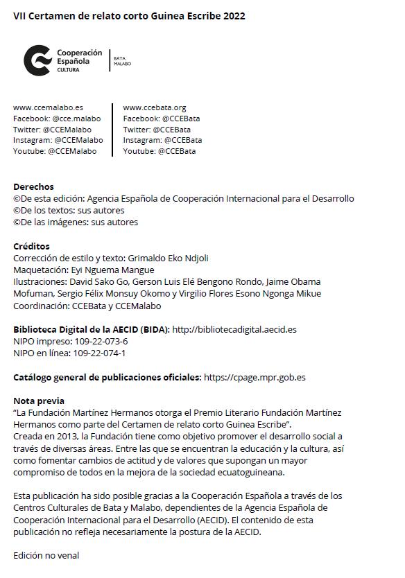 Esta vez, los Centros Culturales de España en Bata y Malabo, como desde hace varias décadas, te ofrecen una oportunidad para que disfrutes de unas obras literarias cortas, de lectura amena y temas excitantes que, mayormente, afectan a la sociedad guineoecuatoriana, pero también del entorno extraguienano. Además de estos temas, te sumergirás también en mundos en los cuales vivirás experiencias nuevas, descubrirás motivos sorprendentes y harás tuyas las vivencias que experimentan los personajes con quienes, además, empatizarás, compartirás alegrías, euforias, tristezas, miedos, y con quienes te identificarás. Y esa es la grandeza de la literatura.
