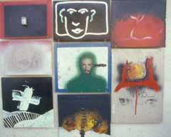 ROBERTO VALCÁRCEL HiSToria con camPo dE alcacHoFaS (1982), técnica mixta (acrílico, lápiz, revistas, fotos, aerosol, café en polvo, látex) sobre cartón y aglomerado de madera. Arriba: fragmentos de la obra original, destruida. Abajo: recreación para la exposición de Roberto Valcárcel "El arte no ha muerto", Museo Nacional de Arte, La Paz, 6 de octubre al 10 de noviembre de 2017. Curaduría: Valeria Paz.