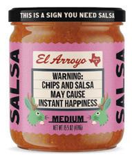 Since 1975, El Arroyo has been serving up Tex-Mex with a side of laughs on our famous marquee sign in Austin, Texas. We are excited to finally share a taste of El Arroyo nationwide with the launch of our shelf-stable restaurantstyle salsa. Packaged in a giftable jar that features six different witty marquee signs per heat level (Mild, Medium, Hot), our fire-roasted salsa complements any dish and is sure to be the talk of the party!