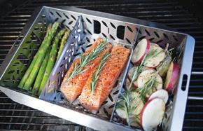 Grilled veggies your way! Our UltraVersatile Grill Basket is a large stainless steel grill basket for grilling vegetables, fish and meat. The versatile basket design with a removable handle easily allows you to grill and separate veggies, seafood and meat. It has 2 movable dividers that can go into 5 positions, giving you the ability to load up the entire basket or customize your grilling space.