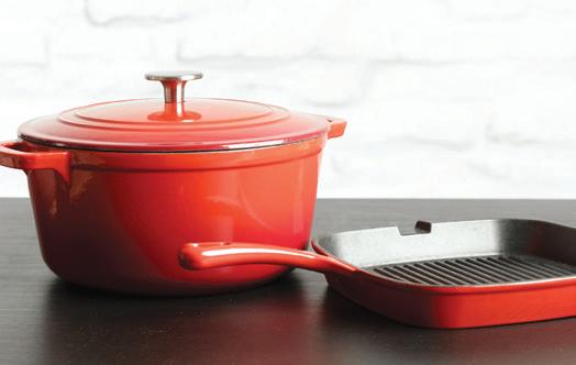 Cookware line includes thoughtfully designed pots and pans with ergonomic handles and knobs. The matte finish and red accents are trend forward, while the pans boast a durable-forged shape aluminum vessel for even heat, strength and warp resistance. The nonstick aluminum offers fast and superior cooking and easy release that makes cleanup a breeze. Other features include comfortable, stay cool handles for a safe grip, tempered and vented glass lids for easy monitoring.