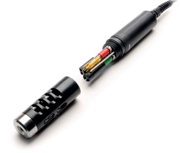 tura incorporado y tres puertos para sensores (reemplazables) de pH (ORP), CE y OD óptico