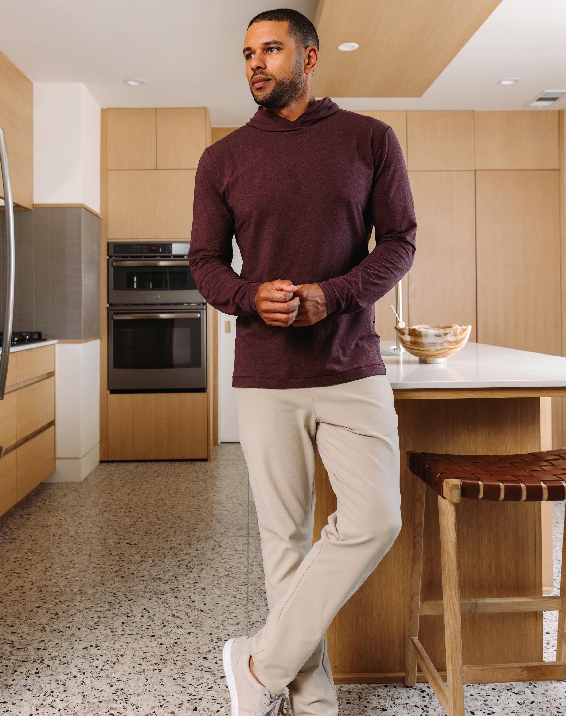 Go-To Hoodie Heather Burgundy, $78 All Day Every Day Pant Taupe, $108