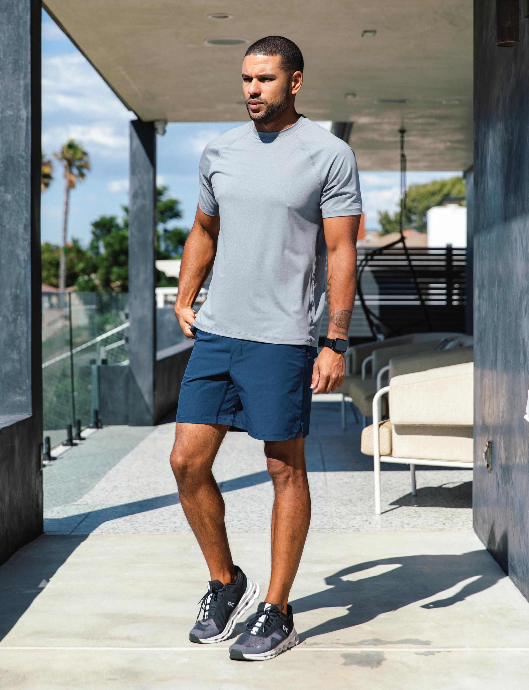 Elevate Crew in Heather Steel, $58 Flex Short in Navy, $68