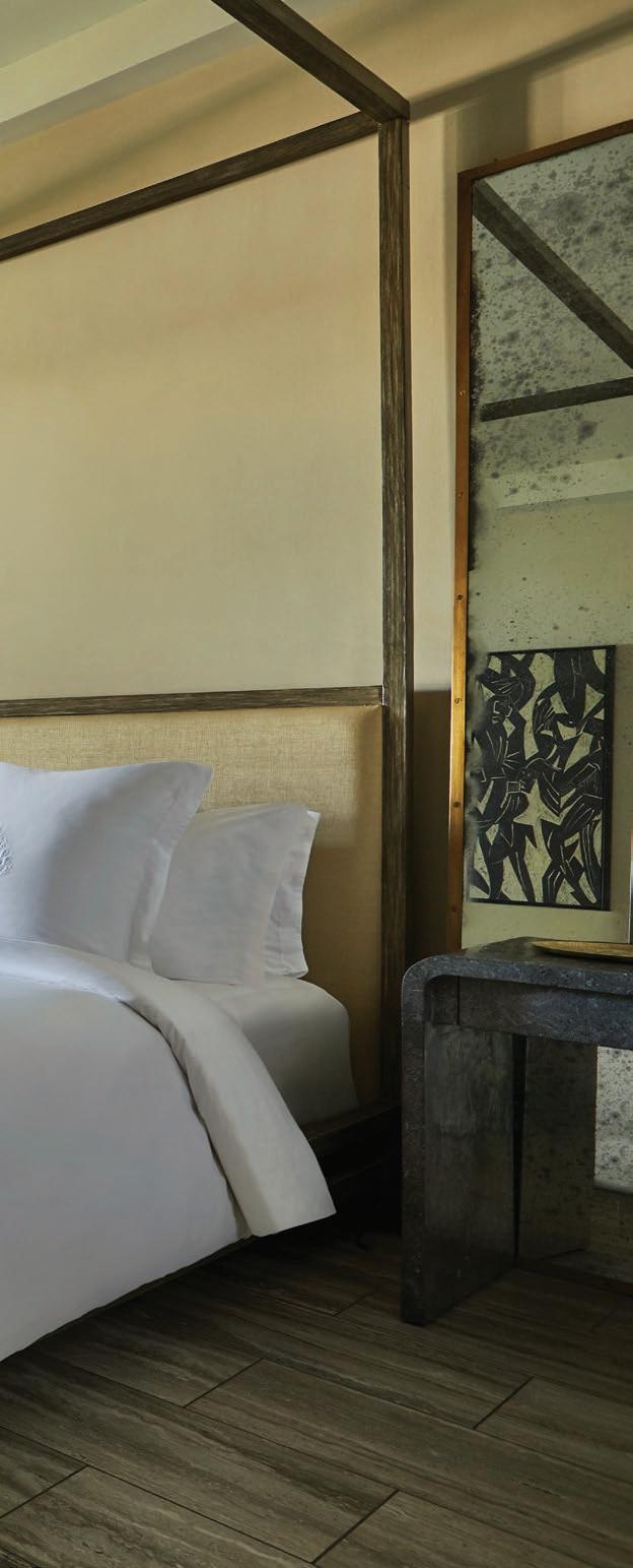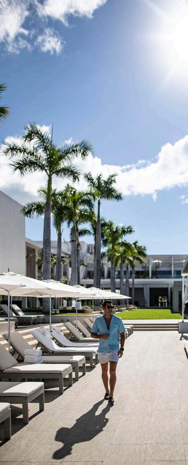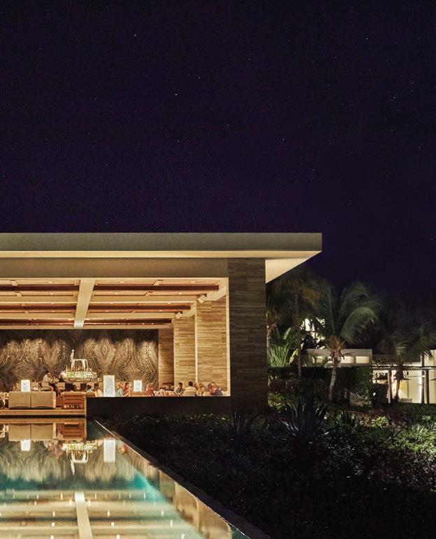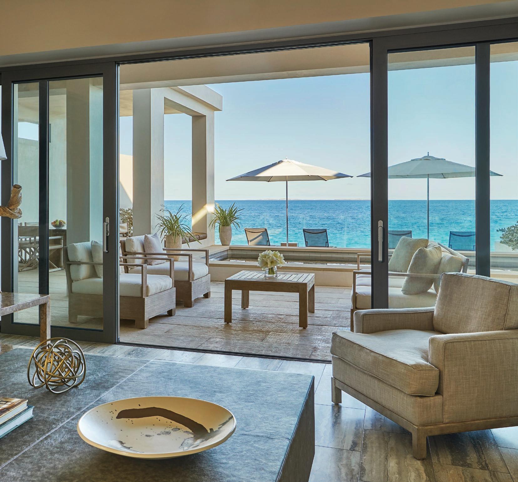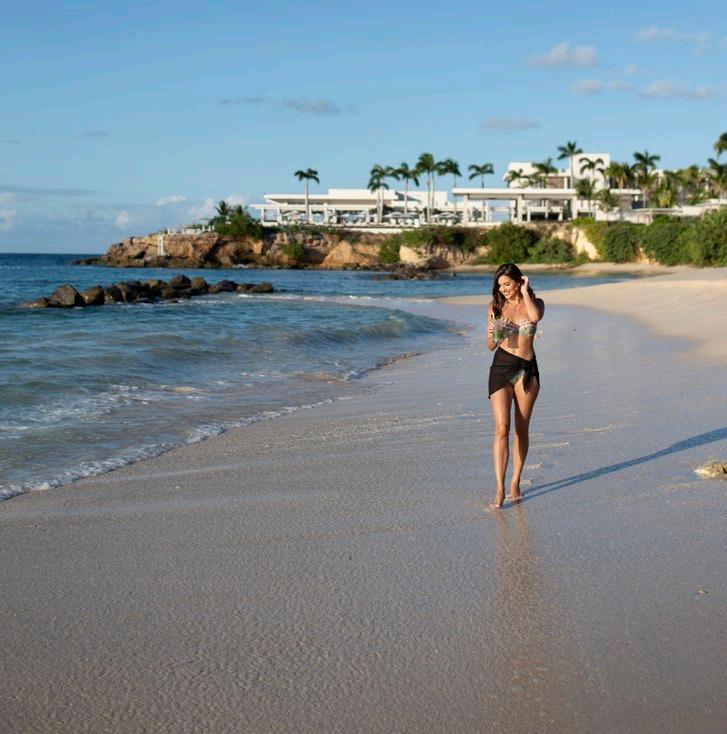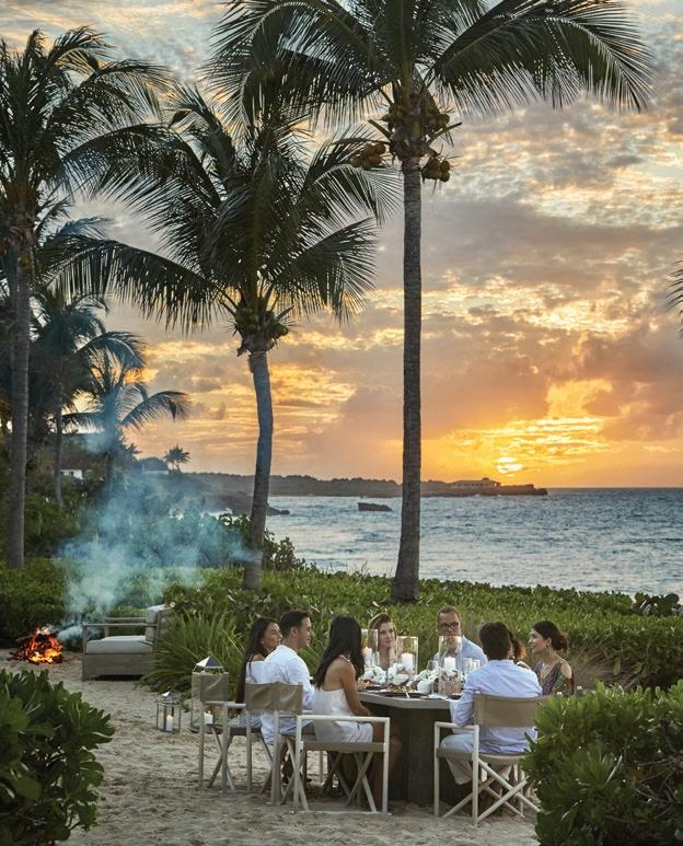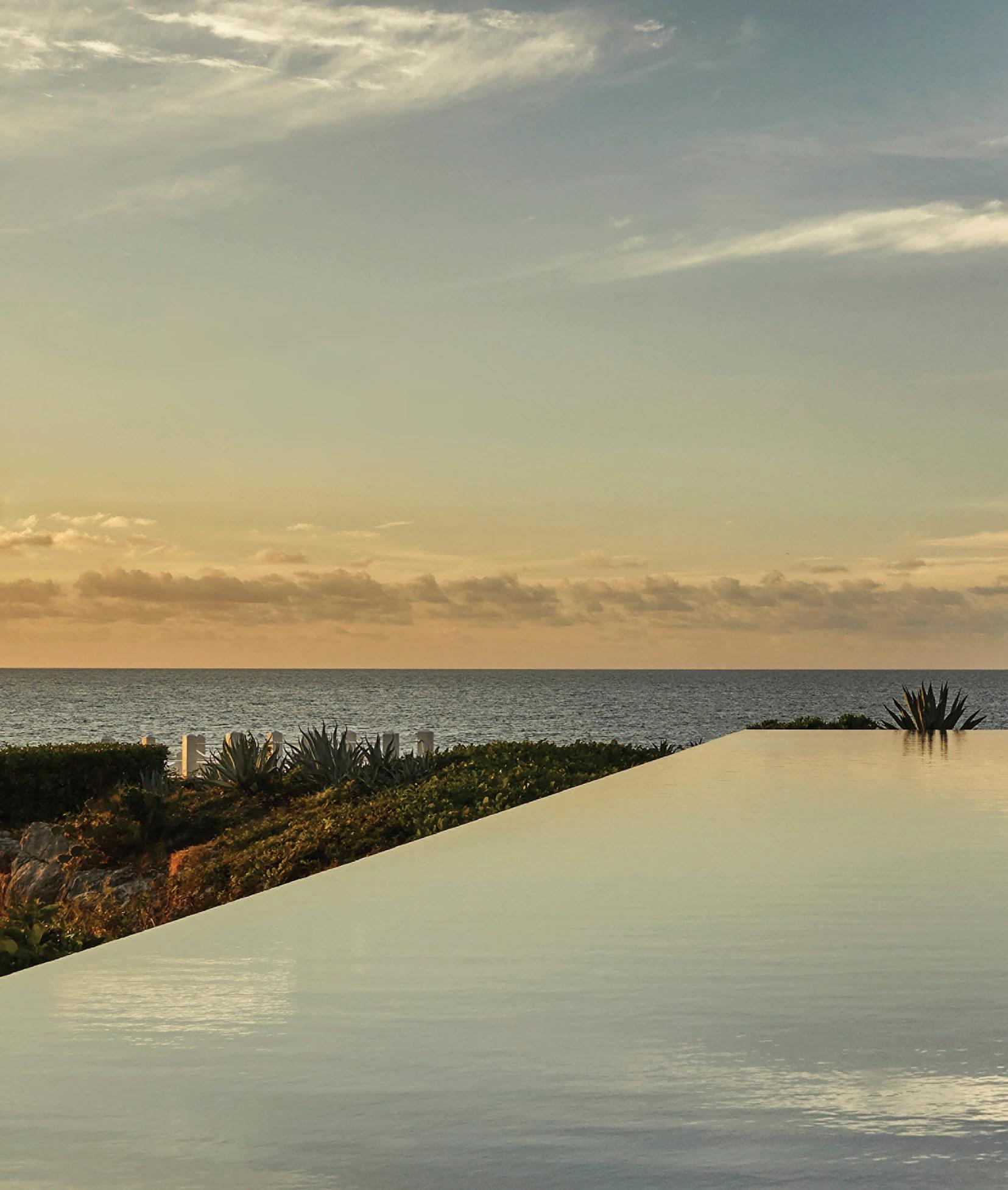 To complement an oceanfront that defies description, Four Seasons Anguilla has pools that surprise and delight. The adult zero-edge Sunset Pool shown here overlooks the brilliant end of the Caribbean Day. Aleta Pool, with nine enormous palms planted in beautifully precise geometry—and big cabanas for gathering—is a fanciful aquatic garden. The Bamboo Pool, familyfriendly, seems to grow from the Meads Bay beachfront. And of course, every home at Four Seasons Private Residences Anguilla has a plunge pool for private dips.