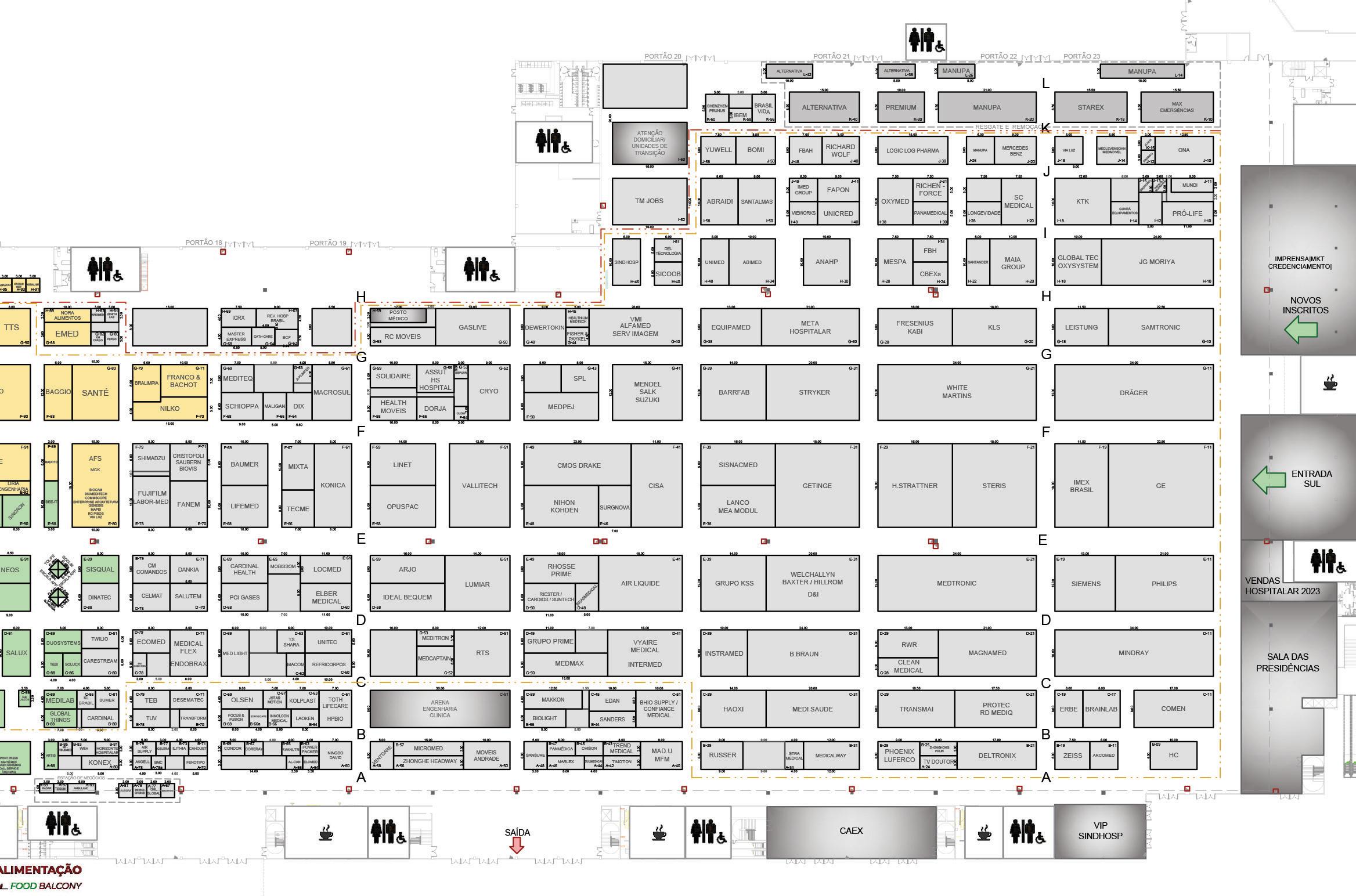 equipamentos, localizado no pavilhão cinza. Acesso à exposição de máquinas, componentes hospitalares e dispositivos médicos.