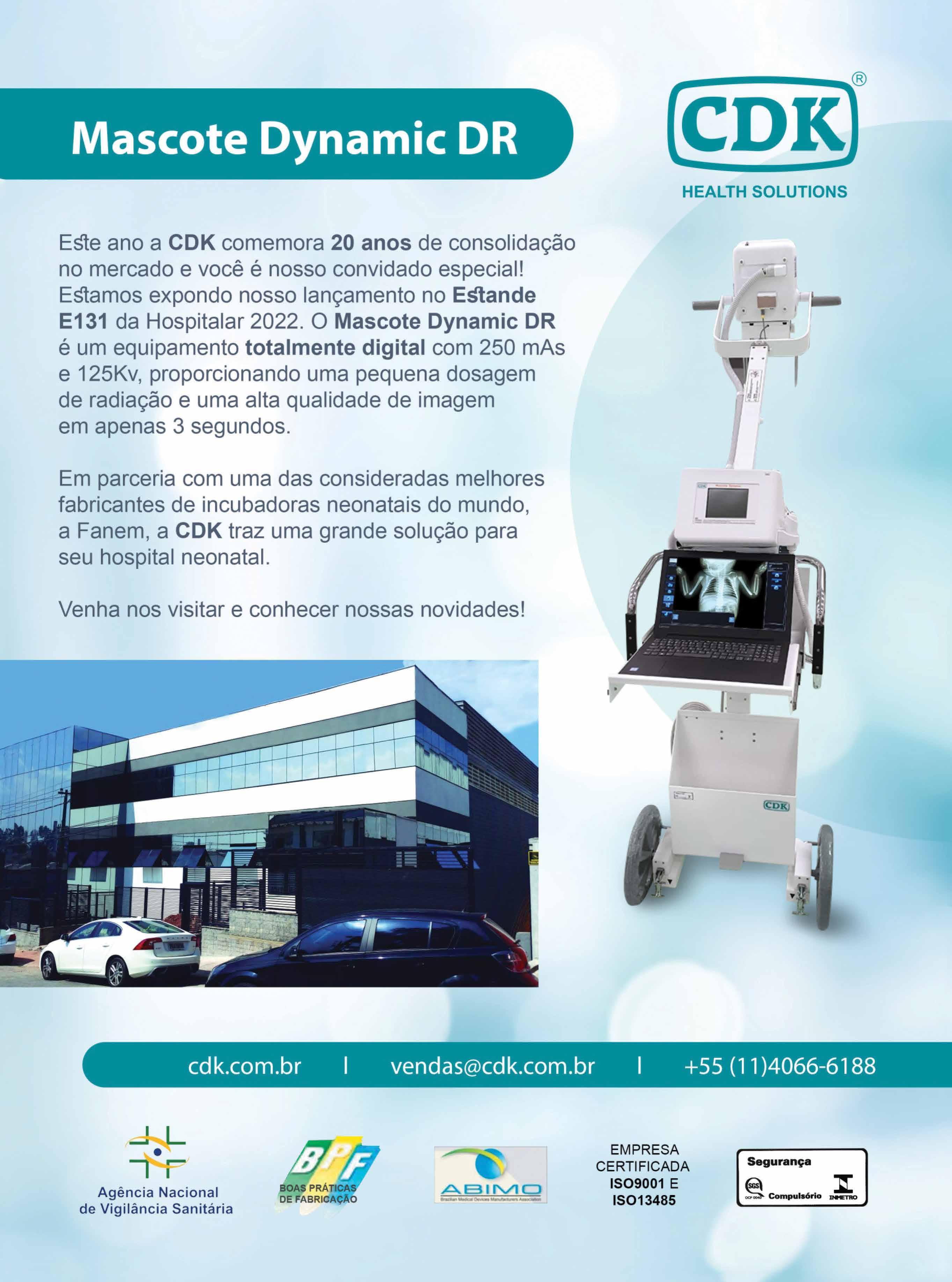 Comemorando seus 20 anos dedicados a fabricação de equipamentos de raios X, a CDK traz para a Hospitalar 2022 o Mascote Dynamic DR, um sistema digital totalmente integrado com moderna tecnologia de geradores de alta frequência que proporciona uma pequena dosagem de radiação com alta qualidade de imagem em apenas três segundos. Sua excelente flexibilidade permite uso em qualquer área clínica, assim como em urgências, pediatria, unidades móveis de atendimento, entre outros.
