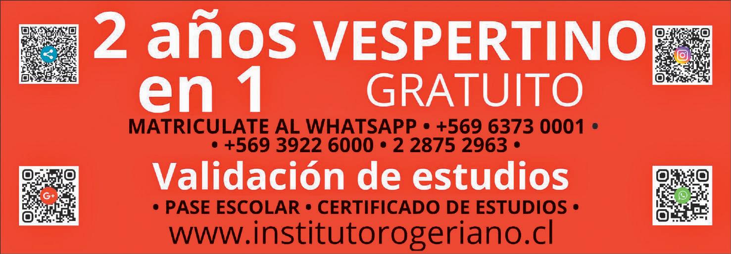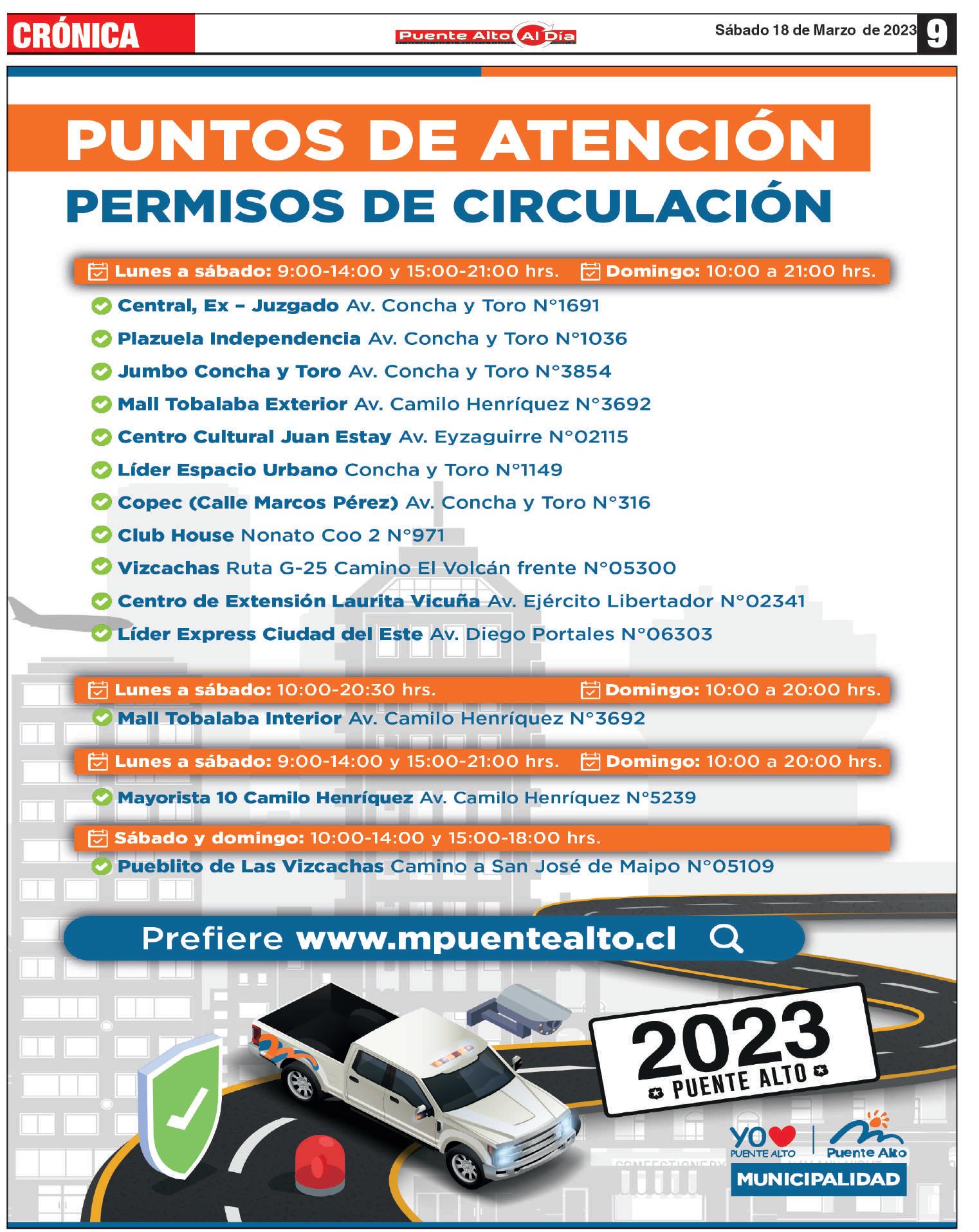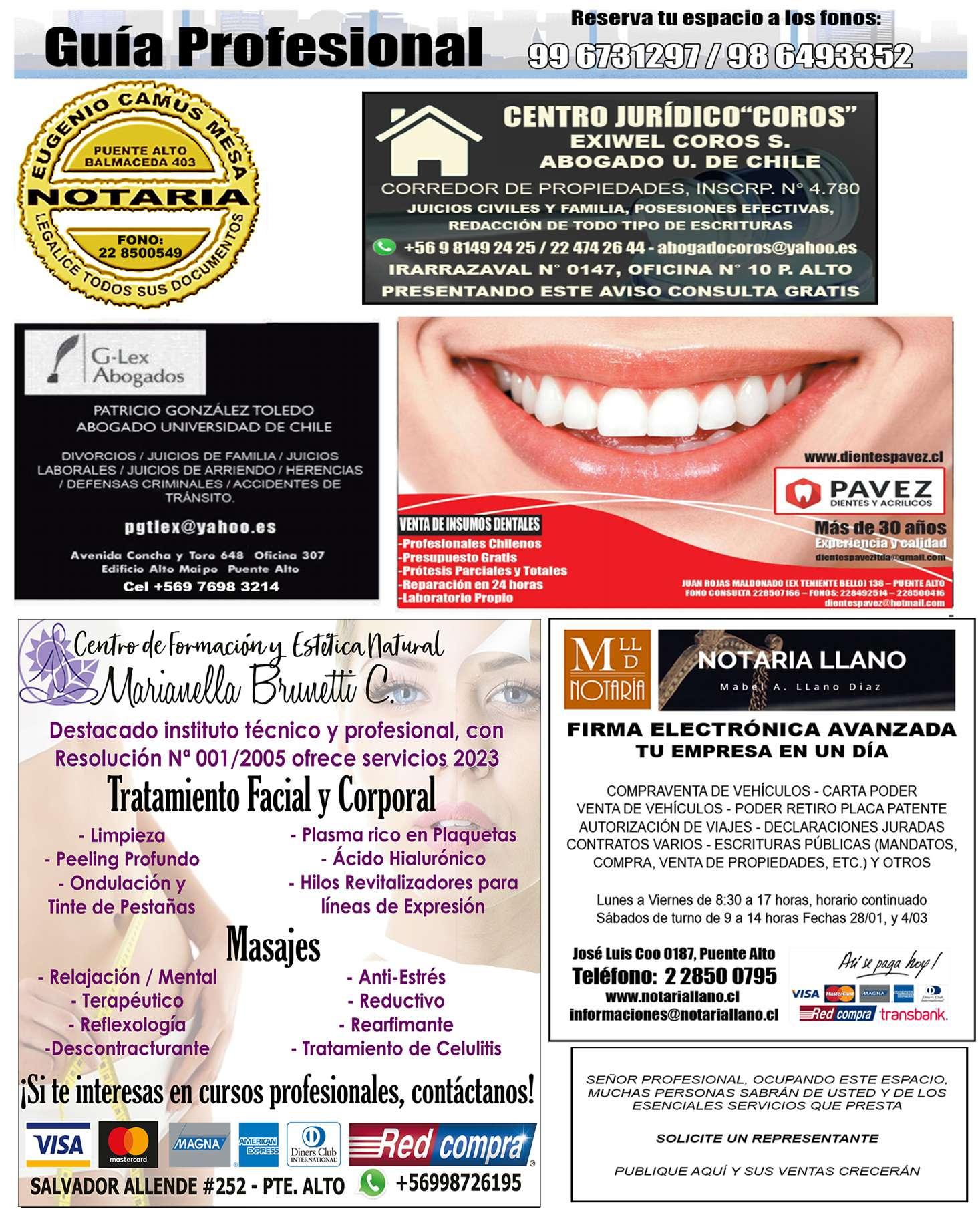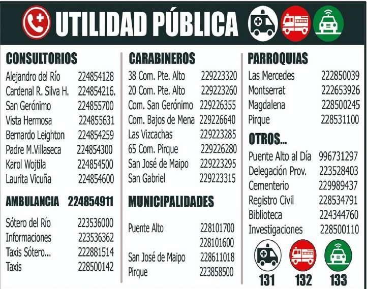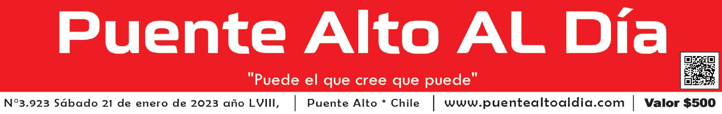 CRÓNICA 2 5 Sábado 18 de Marzo de 2023 FUNDADO EL 14 DE SEPTIEMBRE DEL 1962 EMPRESA PERIODISTICA PUENTE ALTO AL DIA JUAN ROJAS MALDONADO ¨PUEDE EL QUE CREE QUE PUEDE¨ MIEMBRO DE LA ASOCIACIÓN NACIONAL DE PRENSA www.puentealtoaldia.com DIRECTOR Y REPRESENTANTE LEGAL: DOMICILIO: VÍCTOR HUGO ROJAS LÓPEZ EDUARDO CORDERO 0202 OFICINAS GENERALES Y TALLERES GRÁFICOS: Dr. Eduardo Cordero 0202 – Fono +569 9 96731297 Facebook: Puente Alto Al Día Instagran: Puentealtoaldia Twitter: @puentealto_pald Youtube: @puentealtoaldiaTV
