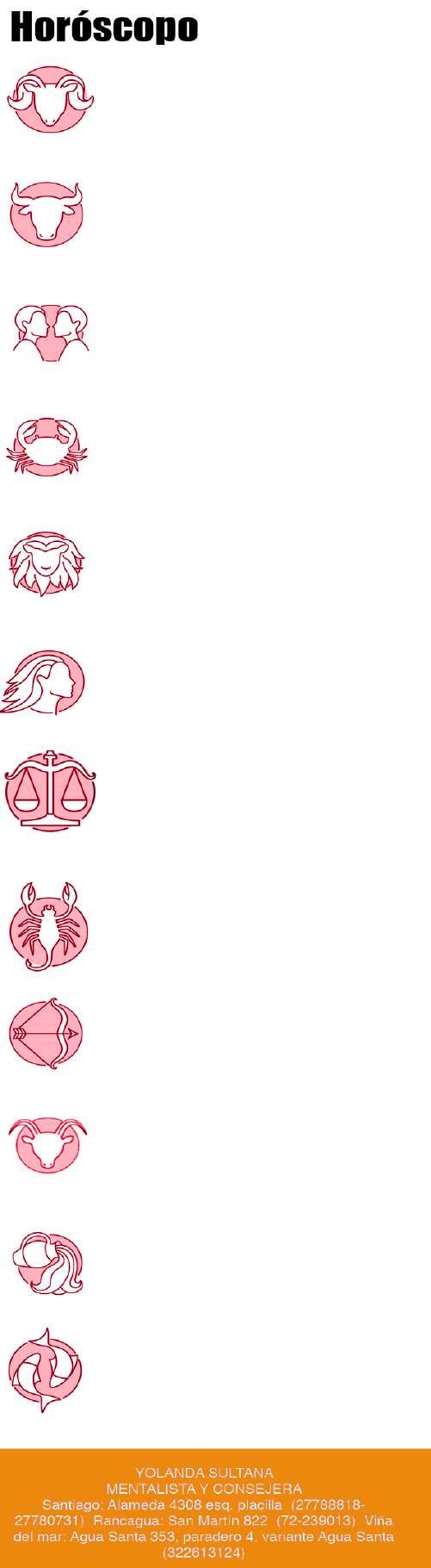 AMOR: Disfrute de esas aventuras de verano, pero ojo que cada cosa tiene una consecuencia. SALUD: Tenga cuidado con el abuso de los analgésicos, eso daña su hígado. DINERO: Continúe poniendo todo su empeño y las cosas irán resultando. COLOR: Verde. NÚMERO: 1.