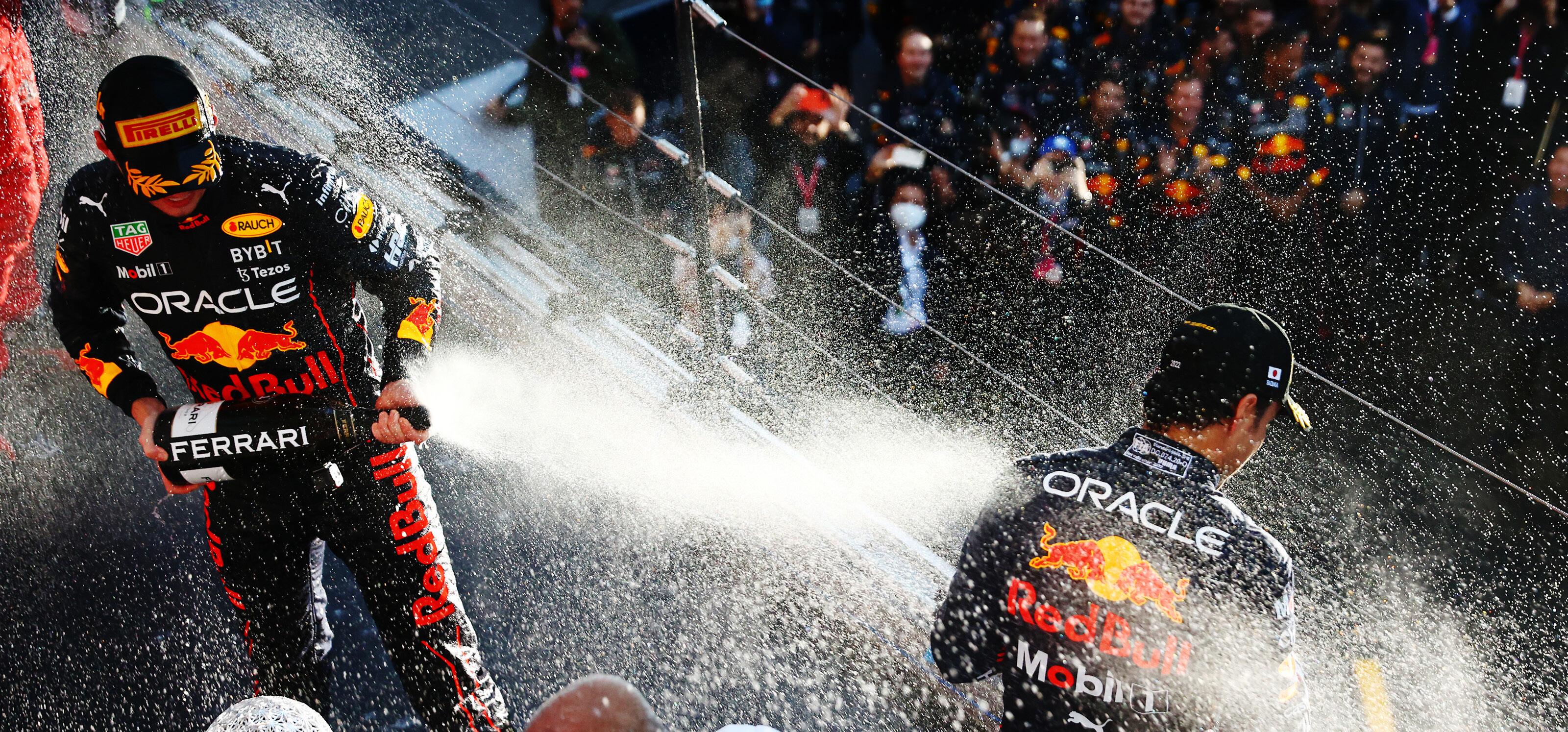 Max como triunfador, Checo rápidamen te recibió el anuncio de la penalización de Leclerc, que se tuvo que conformar con el tercer escalon del podio.
