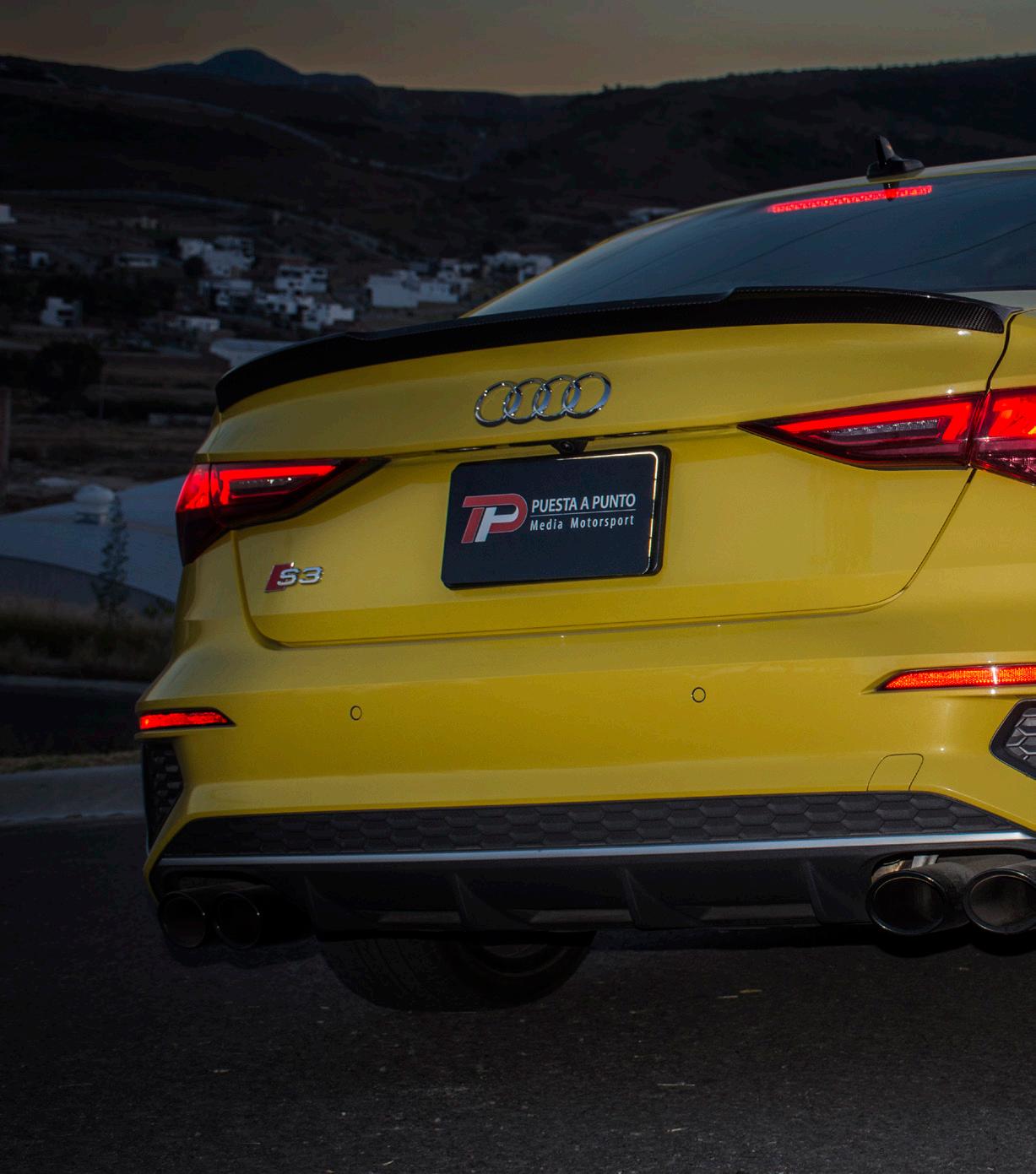 AUDI S 3 Motor: L4 2.0 litros turbo.. Potencia Total: 290 Hp Torque Total 295 Lb-pie Transmisión: Automática S Tronic de 7 velocidades Tracción: Integral Quattro. TÉCNICA FICHA EN NÚMEROS 325 LITROS Es el espacio disponible en la cajuela sin abatir los asientos 4.9 SEGUNDOS ES EL TIEMPO QUE EL S3 TARDA EN ACELERAR DE CERO A 100 KM/H 290 HP Es la potencia que genera el motor turbo que lo impulsa