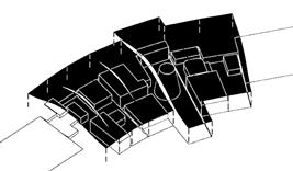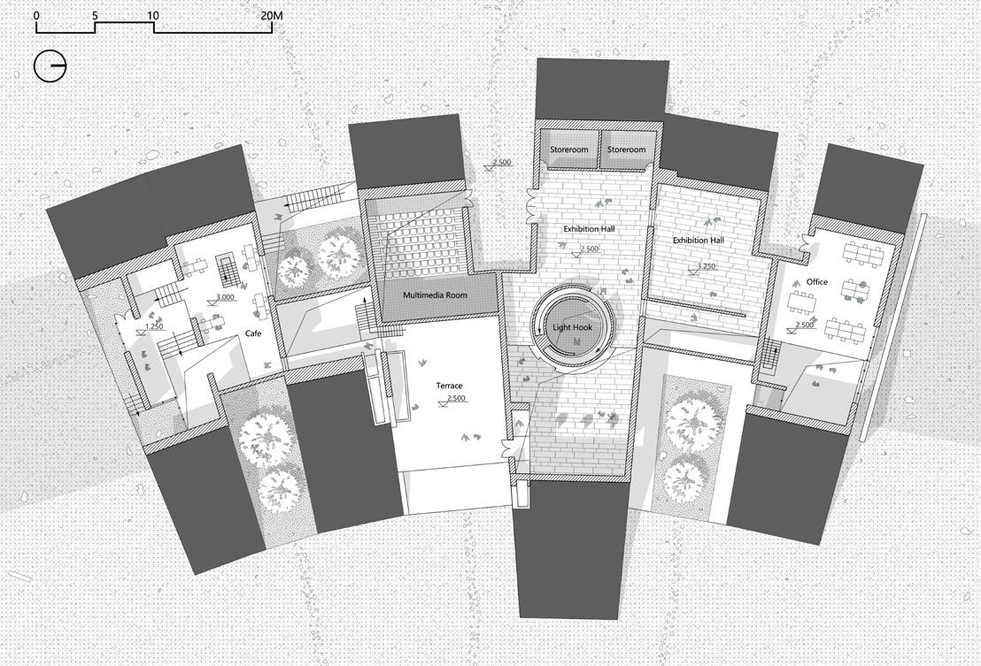 The roof is cut to provide ramps to connect the upper and lower platforms. The height relationship of the interior part of the wall is reversed to prevent the internal space of the building from being seen at a glance.