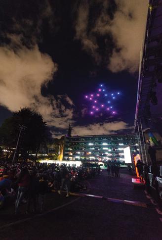 Imágenes de los artistas de la Anaconda Dorada y de las luces de los drones sobre el edificio de parqueaderos de la Universidad.