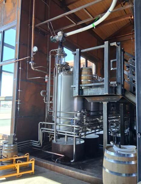 To distill the spirits, they use a copper pot still and column still to increase the alcohol by volume and remove the water. The pot still has a 500-liter capacity and operates on a batch production model. The column still stands approximately 8 feet tall and operates continuously using copper plates to affect the alcohol levels. Copper is required because it removes the impurities during distillation. Once the distillate is condensed, it is sent to a “spirit safe” where the potable alcohol is