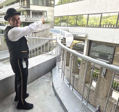 Aziz pointing toward the office where the DNC Headquarters were located in 1972 at the Watergate Complex
