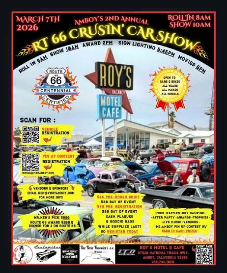 As the Pulse magazine staff highlights one Route 66 state a month (Illinois in January, Missouri in February, and all 14 miles of Kansas in March,) they won't get to California until August. However, California celebrations are already in full swing. Saturday March 7 was Amboy's turn to rock 'n roll, with their "Second Annual Route 66 Cruise." Motorcycles,
