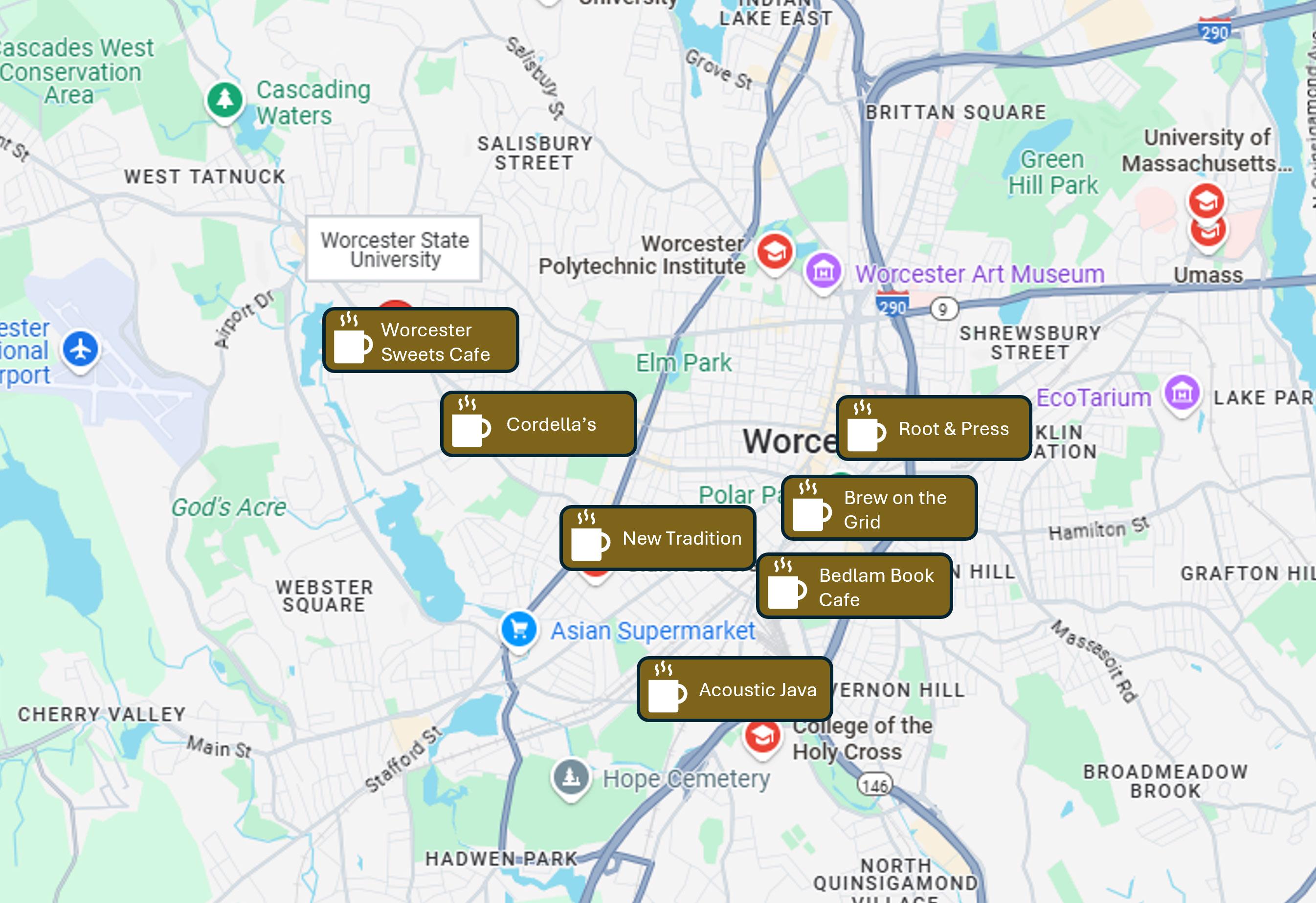 Worcester is the second largest city in Massachusetts and so, of course, it brings in lots of commuters to its many places of business. It also boasts eight major colleges and universities, with students from all around the world. And what’s one of the things that students and those busting their humps at work need most? A great cup (or two) of coffee. With dozens of cafes speckled across the Worcester map, how do you choose? Perhaps it’s the most convenient one on the way to work or one that makes your 2-pump vanilla almond milk latte with extra foam exactly right. Maybe you know a barista somewhere and want to say hello or need a reliable Wi-Fi connection to study for that exam. However, if you are new to the area or just looking for the best cup of coffee in town and need a little guidance finding your caffeine fix, here’s the down low on seven cafes you should definitely try and where to find them.