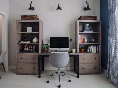 swing-arm sconces and a funky chandelier. The bookcases on either side of one desk feature tons of storage and filing space and give the feel of built-in cabinetry. “We used tables with forged metal legs and wood tops for both desk areas; tables make fantastic desks and offer a lot of surface space,” Ericksen said. “For the kids’ craft space, we utilized a small closet and turned it into a creative work area. Neutral colors were balanced out by a rich blue accent wall, patterned curtains, and a comfy orange chair.”