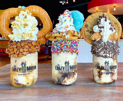 The Crazy Mason, locally owned and operated, is an artistic, crazy, over-thetop dessert destination, serving crazy creations in keepsake custom-designed mason jars and color-changing bowls. Every dessert they make here is almost too much, but that’s kind of the point. When you’re served your treat the first thing that will come to mind is, how exactly do I eat this thing? Don’t worry, you’ll figure it out, and it will be worth it. Try “But First, Coffee,” which includes coffee ice cream blended and poured into a chocolate and marshmallow sauce and chocolate frosted mason jar rolled in Cookie Dirt, and topped with whipped icing, Cookie Dirt, a warm donut, and marshmallow and chocolate drizzle. Or “Have Your Cake and Eat it Too” with birthday cake ice cream in a blue marshmallow swirled jar with vanilla buttercream rim rolled in rainbow sprinkles, topped with a cupcake and a lollipop, then finished with blue marshmallow drizzle, whipped icing and rainbow sprinkles.