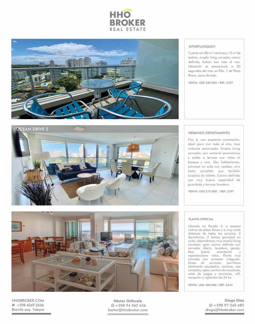 420.000 Edificio muy moderno en Playa Mansa. Living-comedor, terraza con toda la vista a la bahía y Enjoy, 3 dormitorios en suite, toilette, cocina, dep. servicio y todos los amenities. ALEXANDER COLLECTION | Ideal para todo el año. Cuenta con living y comedor, 3 dormitorios 2 baños, cocina amplia, deck con jacuzzi, barbacoa. Terreno: 670 m². Edificados: 150 m². CHALET EN CANTEGRIL | U$S 282.000 Living-comedor, terraza, 3 dormitorios, 2 baños, (1 en suite), toilette, cocina, garaje. Piscina, gym, sala de juegos, servicio de mucama. EDIFICIO CON MUY BUENA RENTA | U$S 260.000 2 dormitorios, 2 baños y toilette U$S 360.000 | 3 dormitorios en suite y toilette U$S 630.000 | 4 dormitorios en suite y toilette U$S 850.000 Consulte por apartamentos más grandes y Penthouse. Excelentes amenities. EDIFICIO PREMIUM - TORRE IMPERIALE | FRENTE AL MAR SOBRE PLAYA BRAVA U$S 635.000 Precio Rebajado