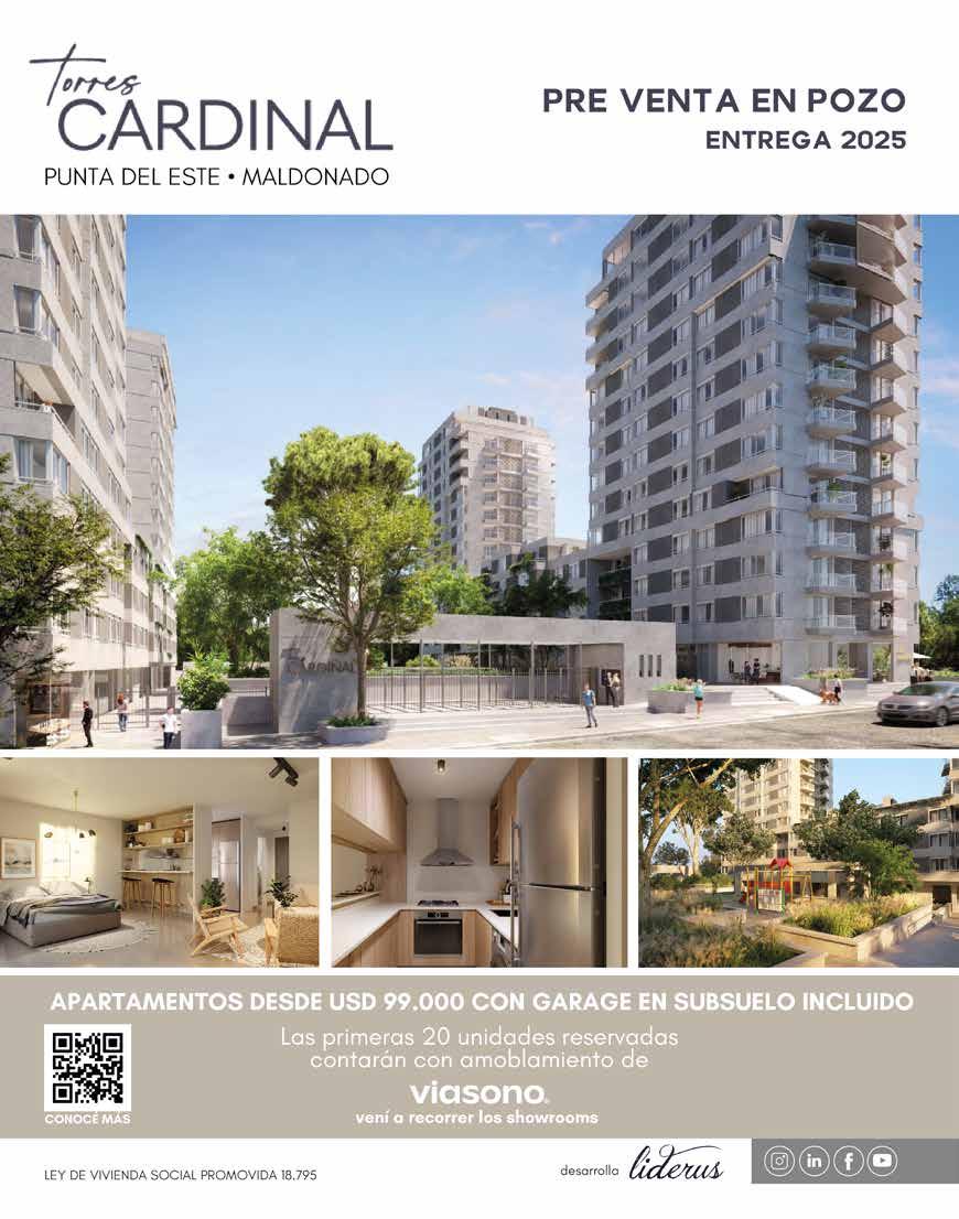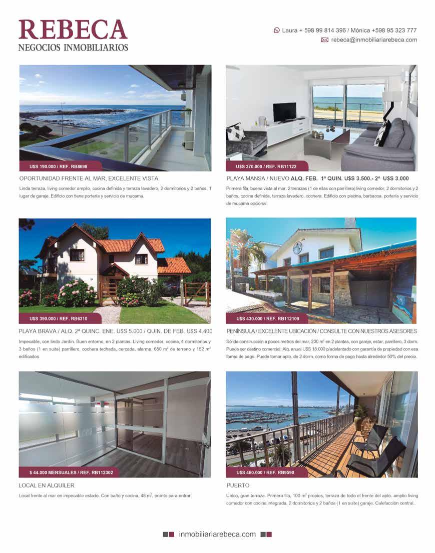 28 Las mejores inmobiliarias de Punta del Este publican en Punta for Sale ® ALEJANDRA RODRÍGUEZ AQUINO Torre del Triángulo Local 027 - Lenzina esq. Fco. Salazar, Parada 2, Punta del Este - info@todopunta.com.uy www.todopunta.com.uy Alejandra Rodrigo (598) 99 811 232 (598) 99 763 727 Oficina (598) 4249 9288/89 Cuentaconserviciodemucamaoptativo,piscina,parrilleros comunes,gimnasio.Apartamentoreciclado.Living-comedor, terraza, 2 dormitorios, 2 baños, cocina, lavadero, garaje. EDIFICIO A PASOS DEL SHOPPING | U$S 185.000